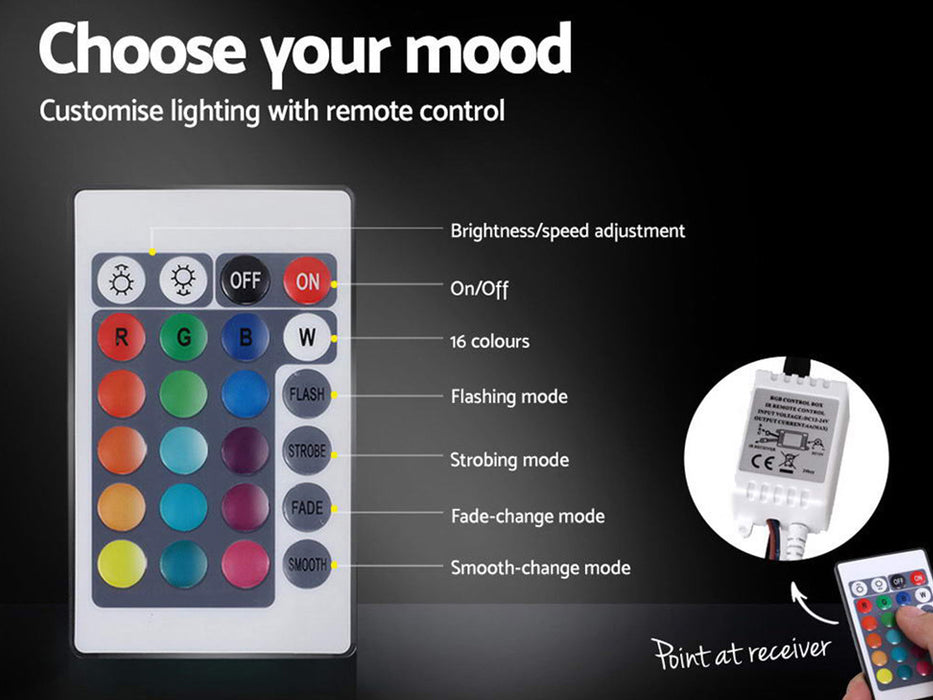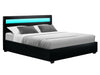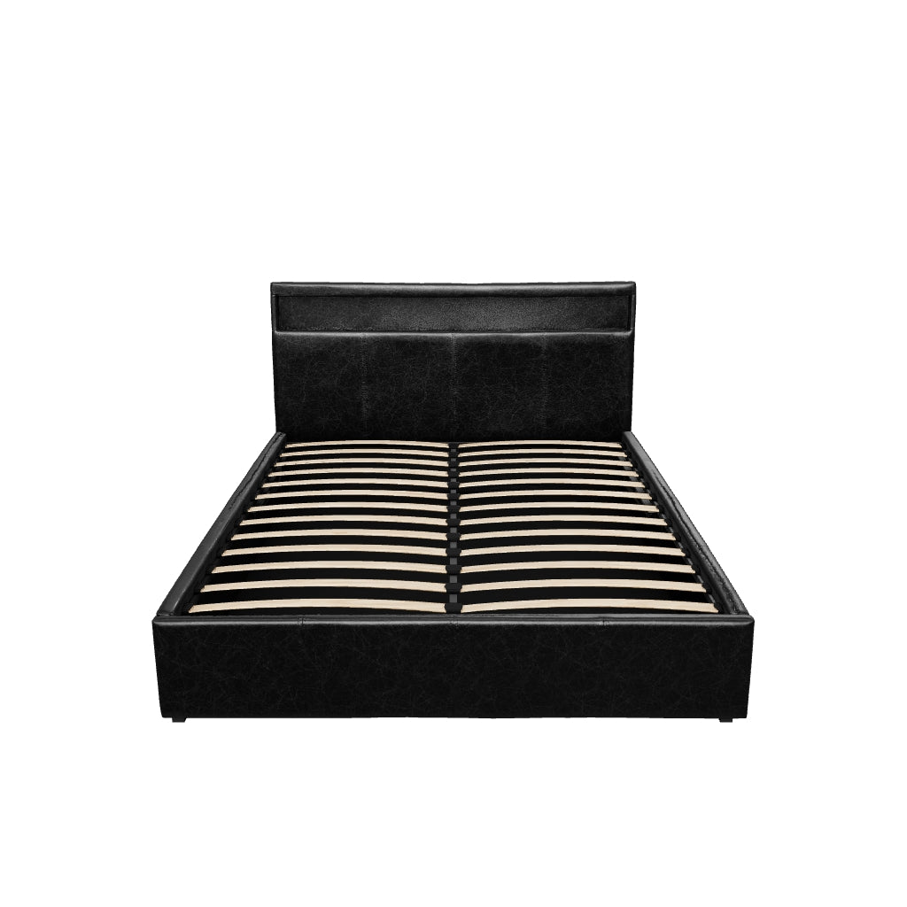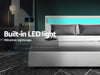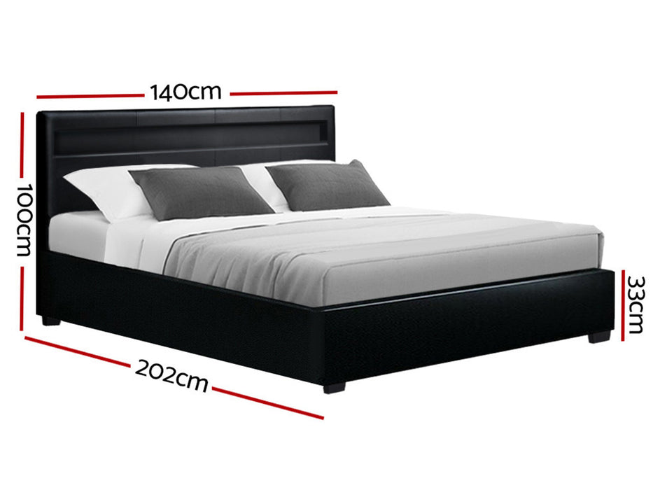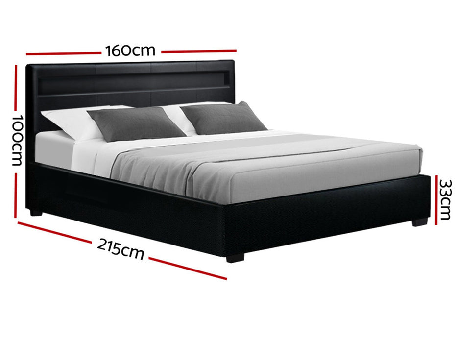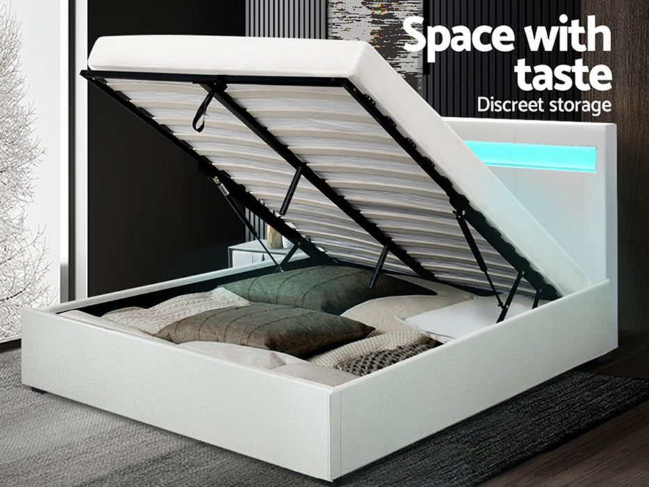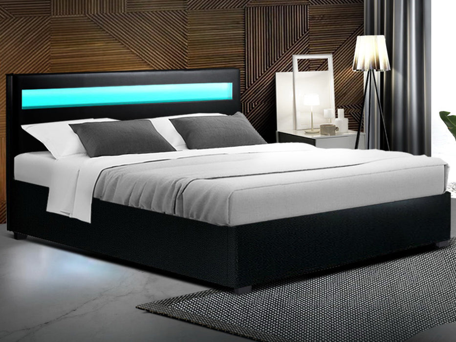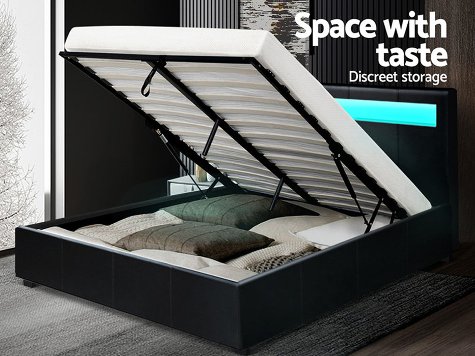 Upholstered with premium PVC leather LED light bedhead 16 LED colours and 4 flashing modes Padded with high density foam Reinforced wooden construction Storage compartment Gas lift hinged base Heavy-duty metal connectors Sturdy legs Easy assembly Button battery type for remote: CR2025 or CR2032