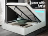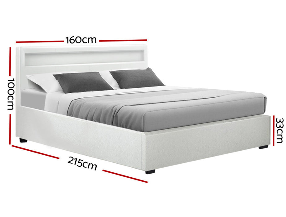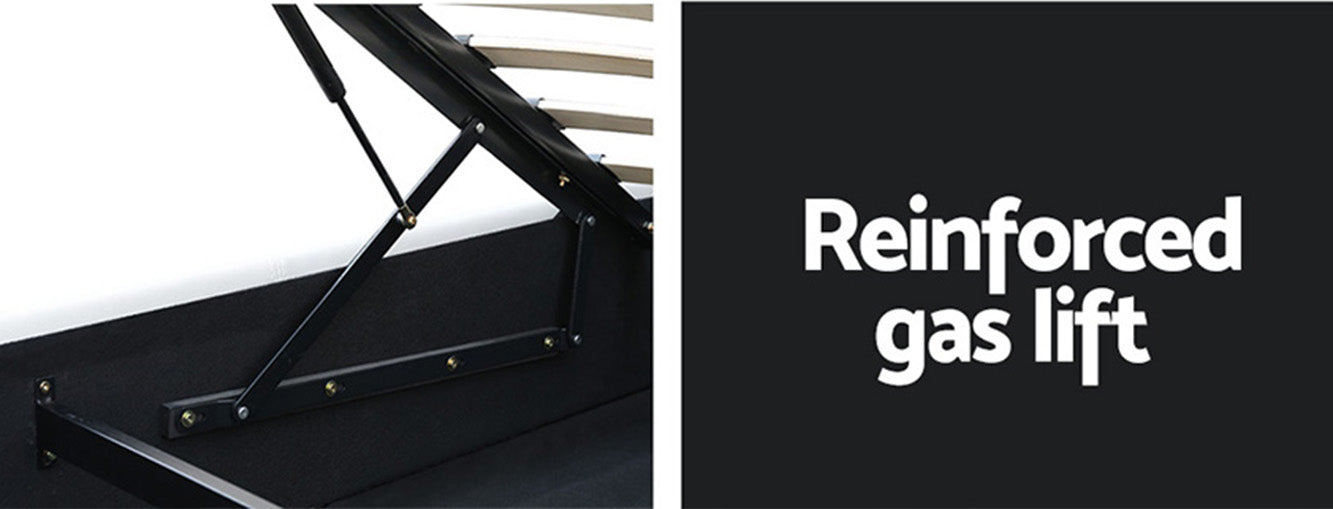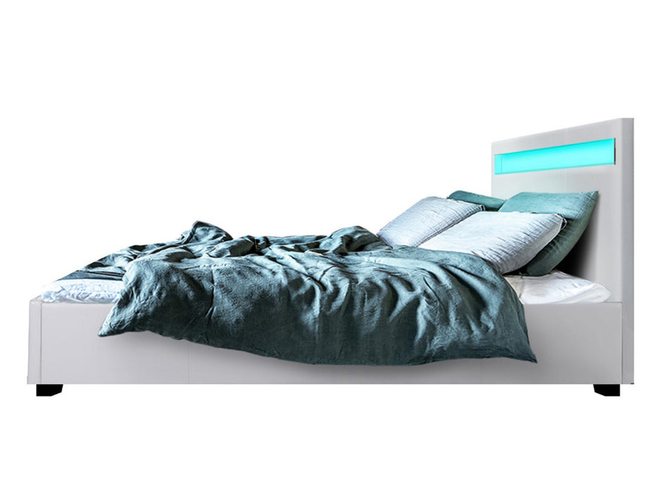 When is a bed more than a bed? When it uses our Clara PU LED Lift Bed. On the outside, this bed frame looks like just any other quality bed frame. Beautifully padded with generous foam and covered in PVC leather. Strong steel frame with high grade steel centre rails, heavy-duty bars and arched slat base. Large and comfortable headboard. But with one easy gas lift of the bed base, the bed frame becomes an instant storage area with acres of space for your bedding essentials. Simply store your extra pillows, bed sheets, cushions and more in the storage compartment and hide them away for the season. Even better, you no longer have to fumble in the dark for a light switch in the middle of the night with this bed frame. It comes with built-in LED lighting that can be customised into 16 different colours and 4 flashing modes to suit your preference. Not only will the illuminated bed frame create a beautiful ambience, it will also save you from buying extra bedside lamps or nightlights. So do not just get any bed frame, get this 3-in-1 bed frame to expand your home storage capacity and light up your nights with just a lift of your hands.