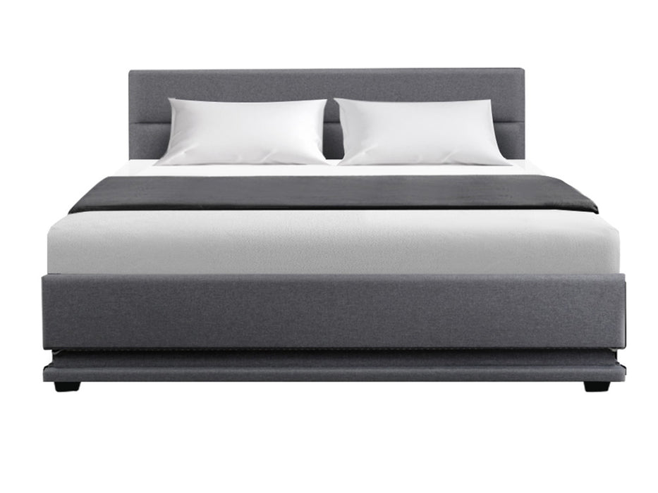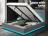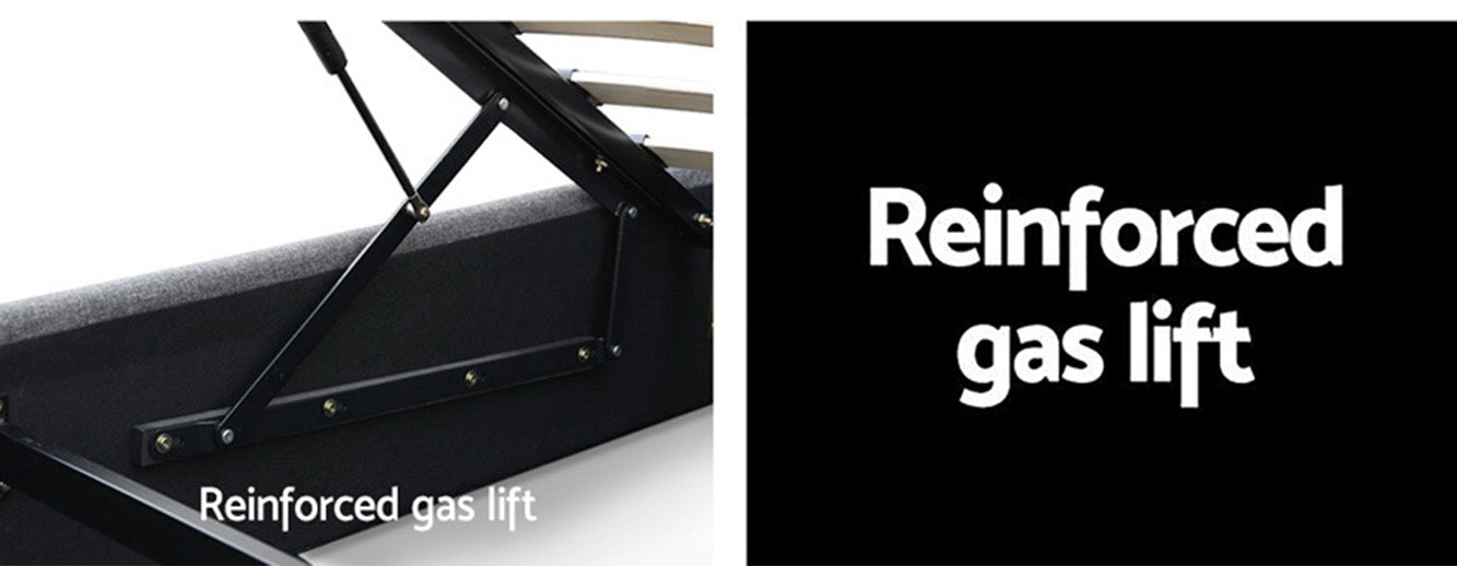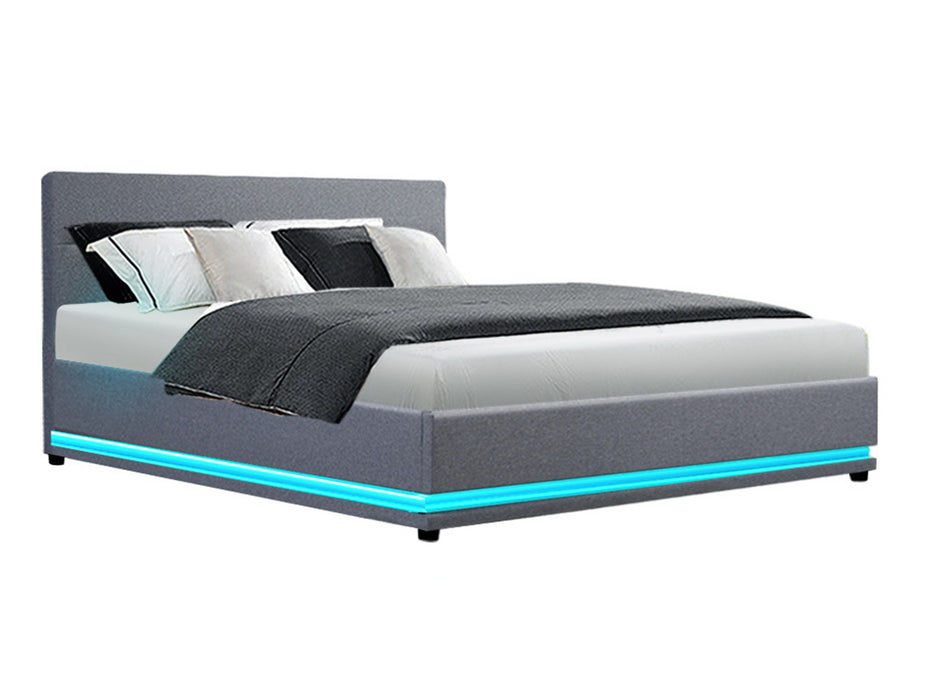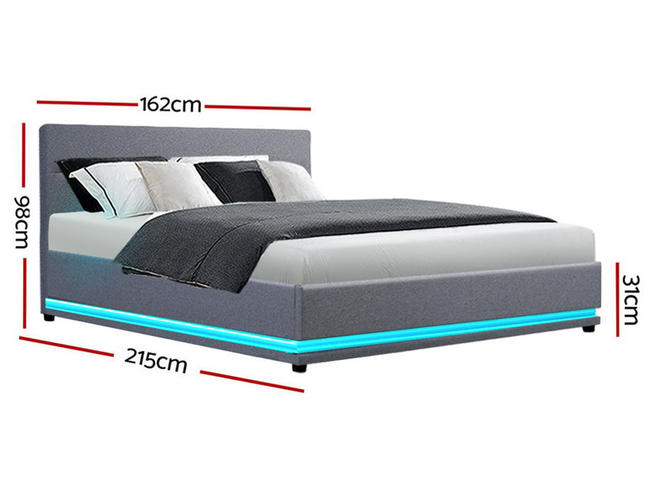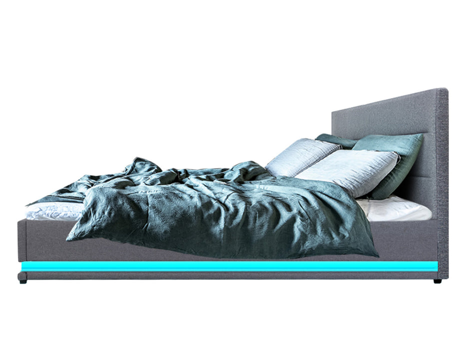 When is a bed more than a bed? When it uses our Ulen Fabric LED Lift Bed. On the outside, this bed frame looks like just any other quality bed frame. Beautifully padded with generous foam and covered in premium faux linen fabric. Strong steel frame with high grade steel centre rails, heavy-duty bars and arched slat base. Large and comfortable headboard. But with one easy gas lift of the bed base, the bed frame becomes an instant storage area with acres of space for your bedding essentials. Simply store your extra pillows, bed sheets, cushions and more in the storage compartment and hide them away for the season. Even better, you no longer have to fumble in the dark for a light switch in the middle of the night with this bed frame. It comes with built-in LED lighting that can be customised into 16 different colours and 4 flashing modes to suit your preference. Not only will the illuminated bed frame create a beautiful ambience, it will also save you from buying extra bedside lamps or nightlights. So do not just get any bed frame, get this 3-in-1 bed frame to expand your home storage capacity and light up your nights with just a lift of your hands.