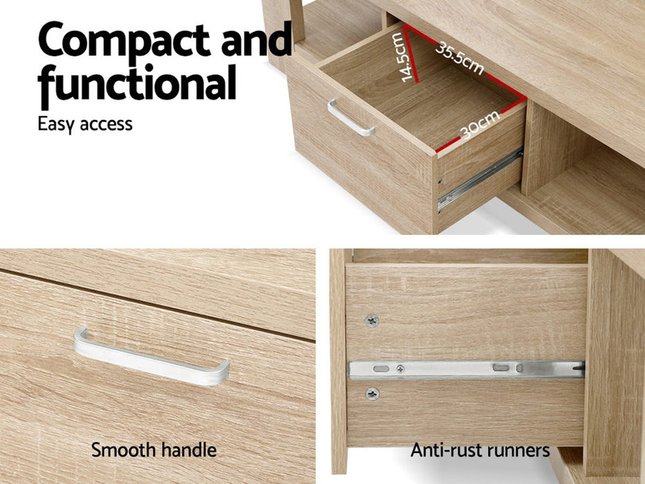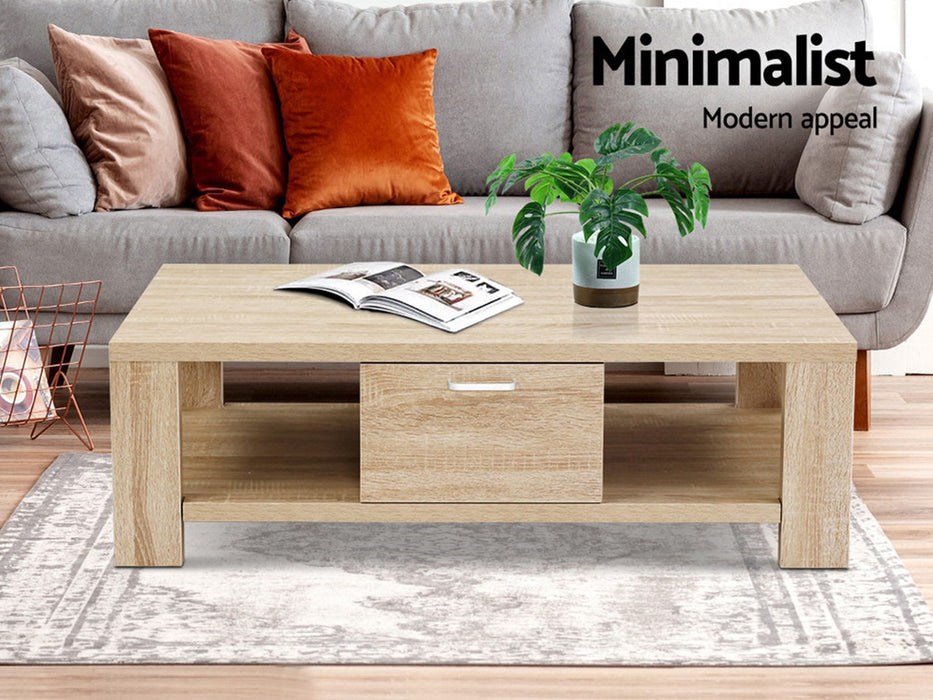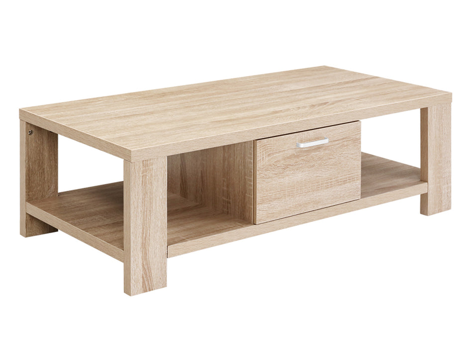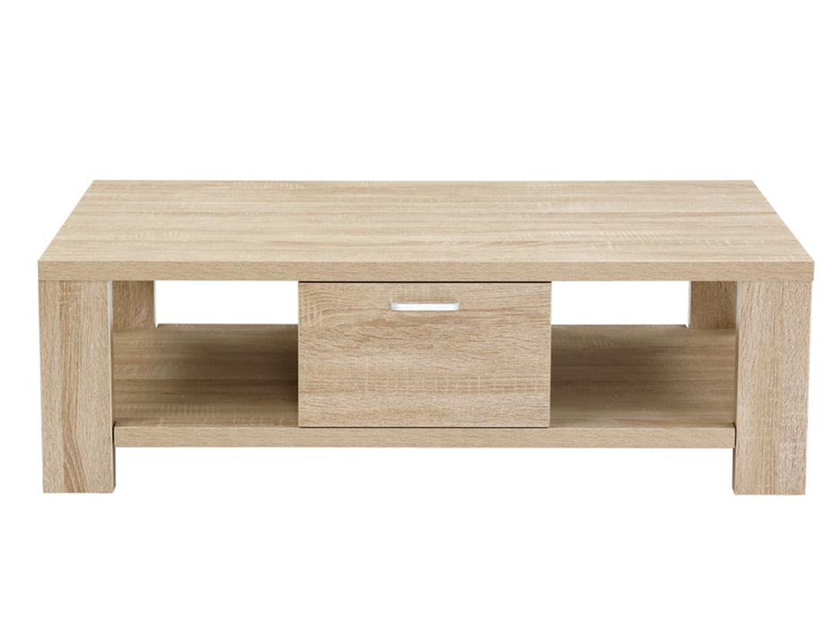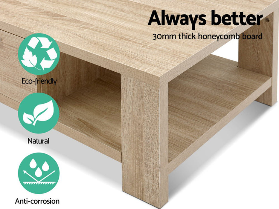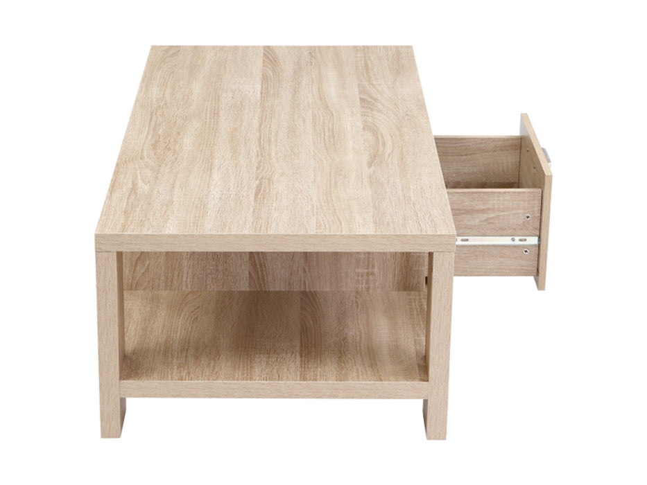 Keep all your books, magazines, remote controls and other entertainment paraphernalia from cluttering up your living room with our Bronson Coffee Table. Incorporating a contemporary design and presented with durable and strong 30mm thick honeycomb board and 15mm thick particle board with beautiful natural woodgrain finish, our coffee table displays great craftsmanship with equally fine hardware to ensure trouble-free use every time. It has open side shelves and one large central drawer with a sleek handle and anti-rust runners that allow you to always have easy access to all your necessities. The simple and linear design means that the table will suit any décor and be the perfect addition to your modern living room. Better still, you can also match with other products from the Bronson series for the complete simple-natural look.