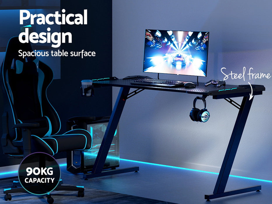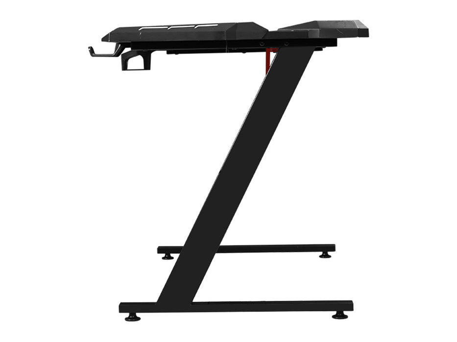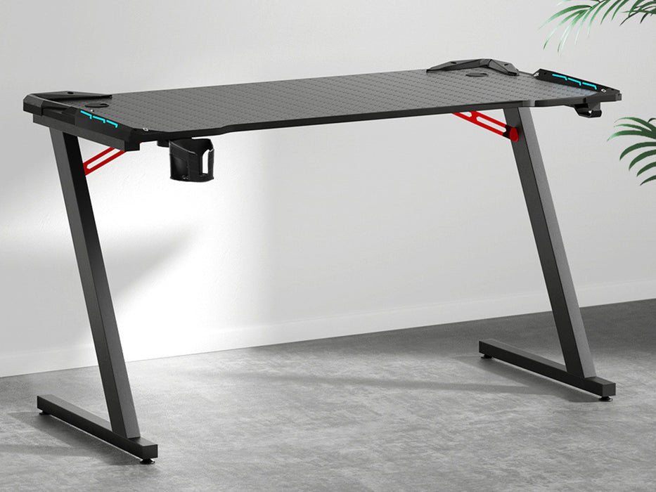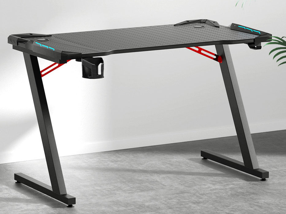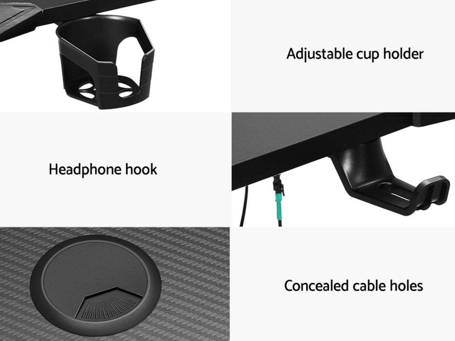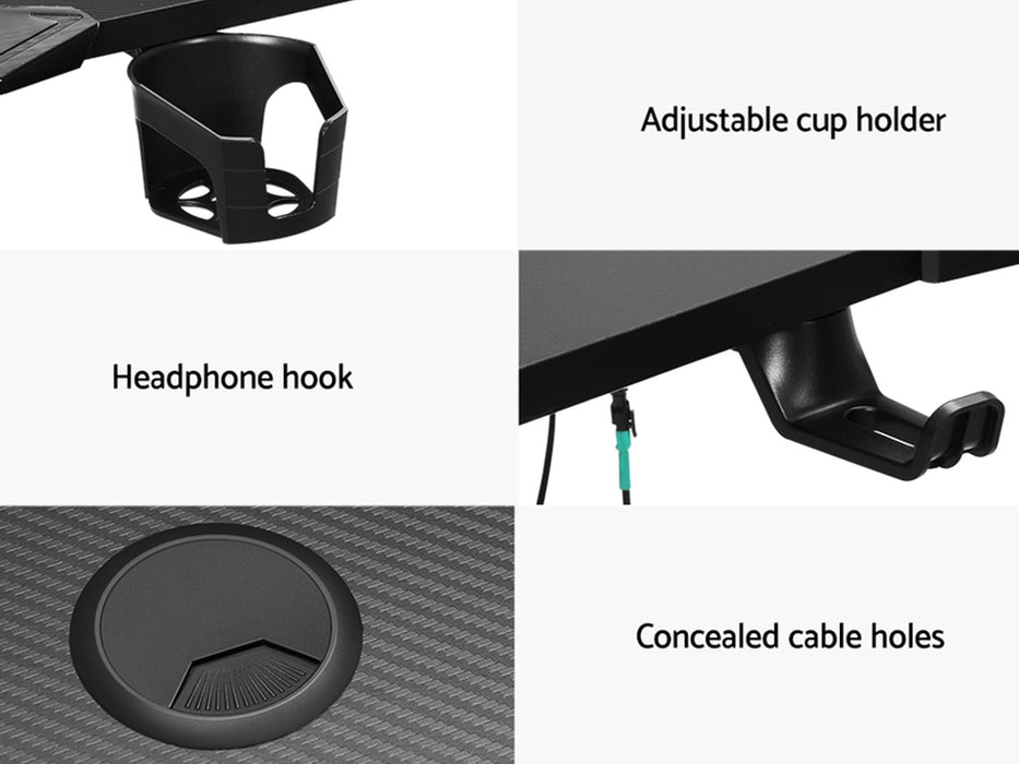 Solid steel frame Wide table surface Headphone hook Adjustable cup holder Seven different colours RGB light effects Adjustable brightness Z-shaped legs Adjustable foot pad Built-in cable management system Practical design Carbon fibre texture Waterproof, non-slip, and easy to clean Easy assembly