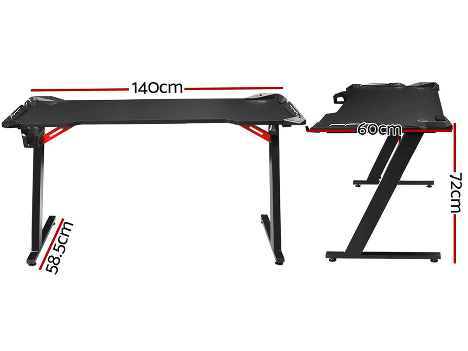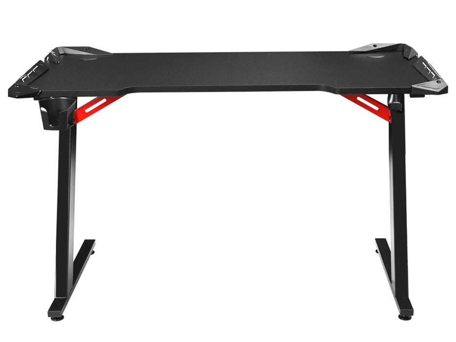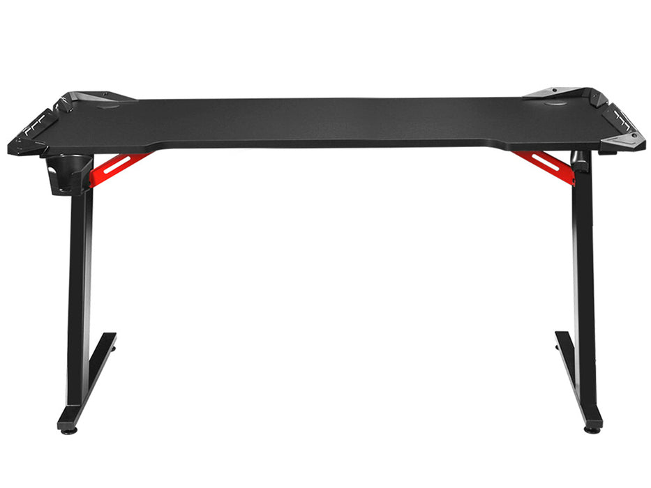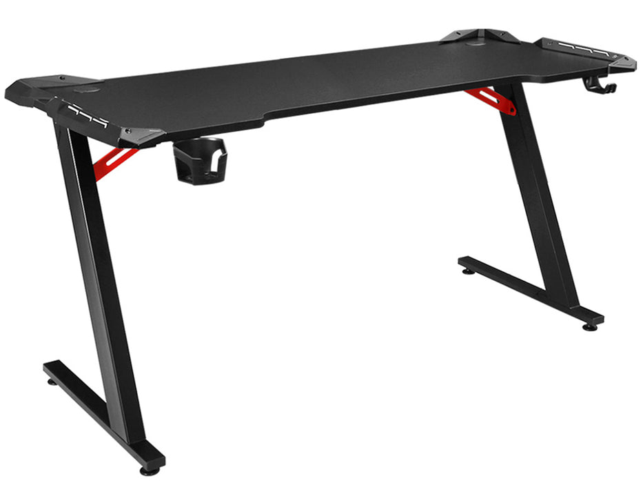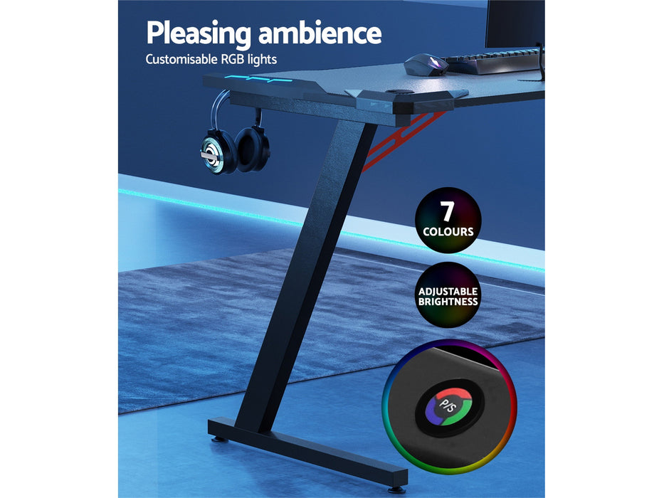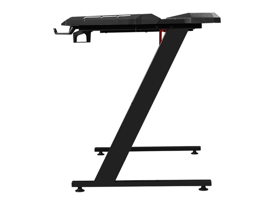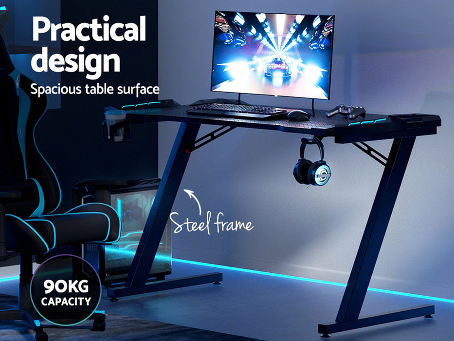 Solid steel frame Wide table surface Headphone hook Adjustable cup holder Seven different colours RGB light effects Adjustable brightness Z-shaped legs Adjustable foot pad Built-in cable management system Practical design Carbon fibre texture Waterproof, non-slip, and easy to clean Easy assembly