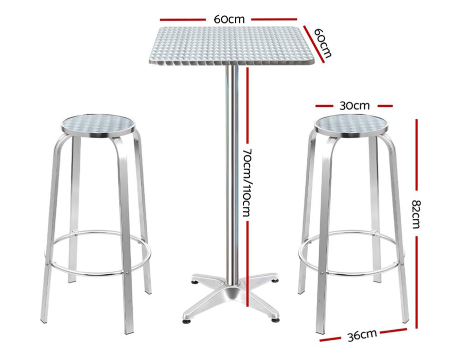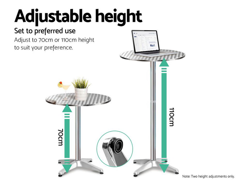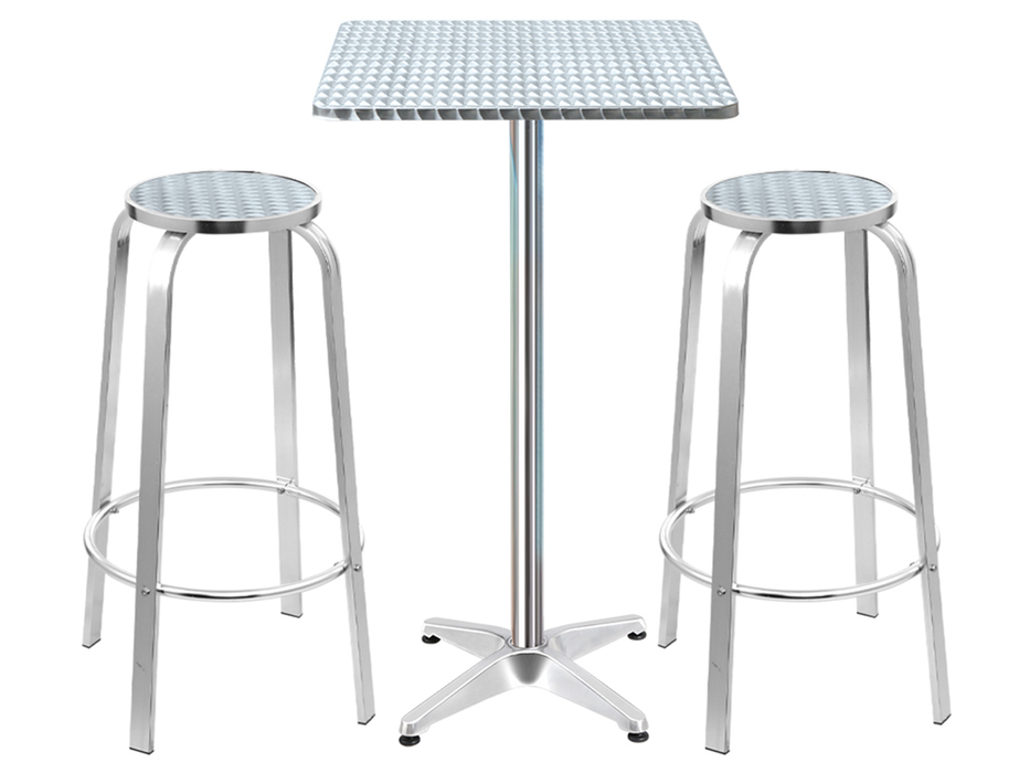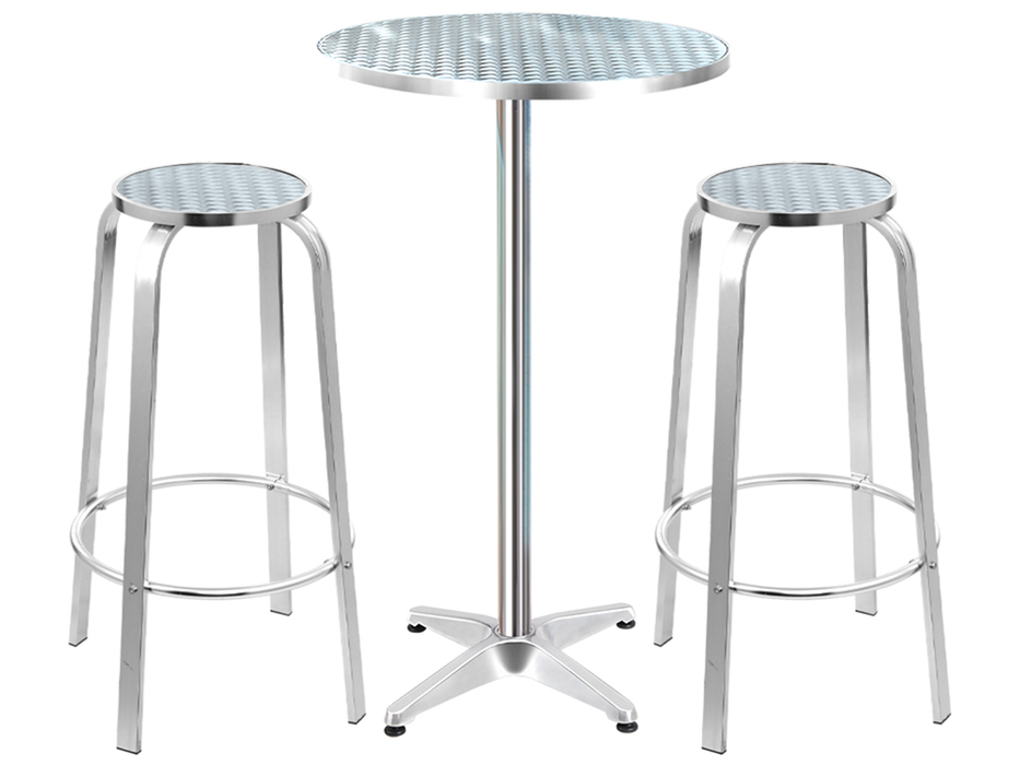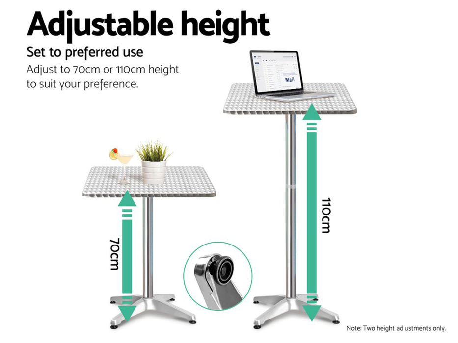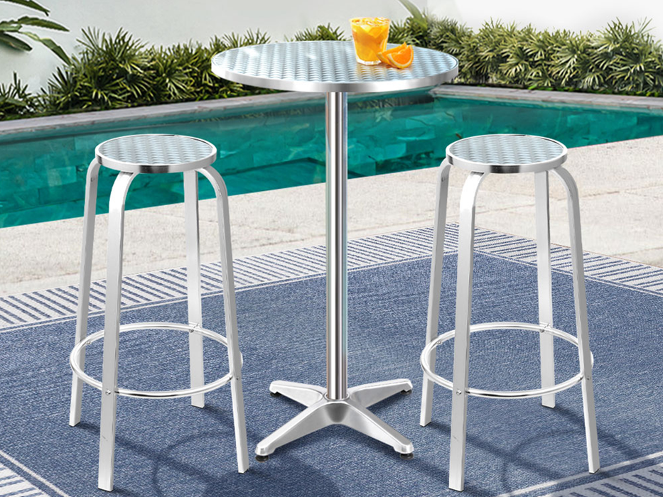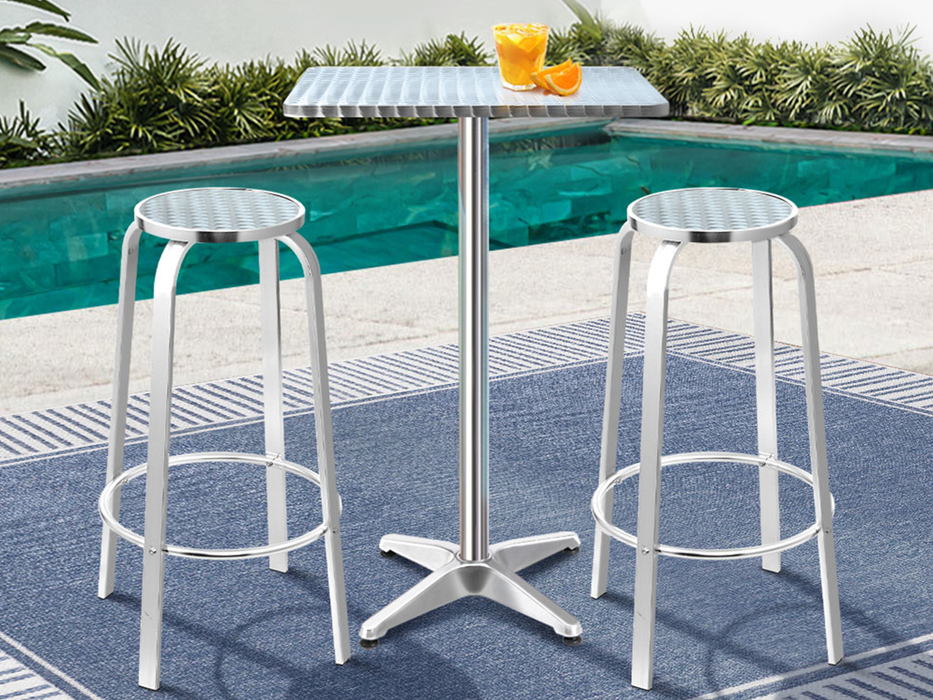 Entertain in style with our contemporary Ala-Bistro Outdoor Bar Set. Comprising two stools and one table, this bar set is stunning in looks and equally as functional. The aluminium stool is flawlessly finished and looks simply stunning from any angle. The eye-catching seat really captures your attention while the upgraded reinforced circular footrest gives the stool an aura of confidence all over. With its aluminium construction, the stool is lightweight and yet strong and sturdy to handle up to 150kg in weight capacity. The matching bar table is height-adjustable and can be set to your preferred height at 70cm or 110cm. The smooth tabletop and sturdy base ensure that your drinks only go down one way and definitely not on the floor. Stowing it away is just as simple as a flick of the quick release lock to fold it away. Perfect for bistros, cafes, pool areas and home patios, our bar set is worth drinking to.