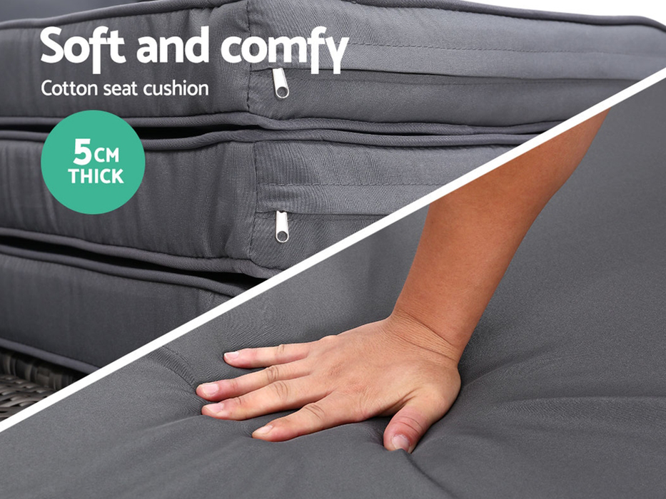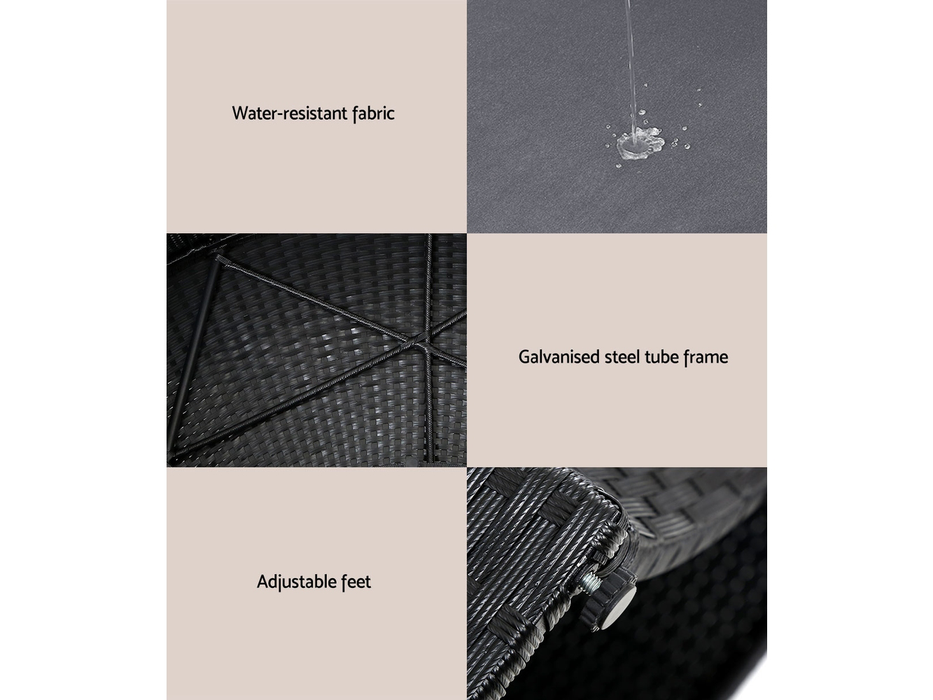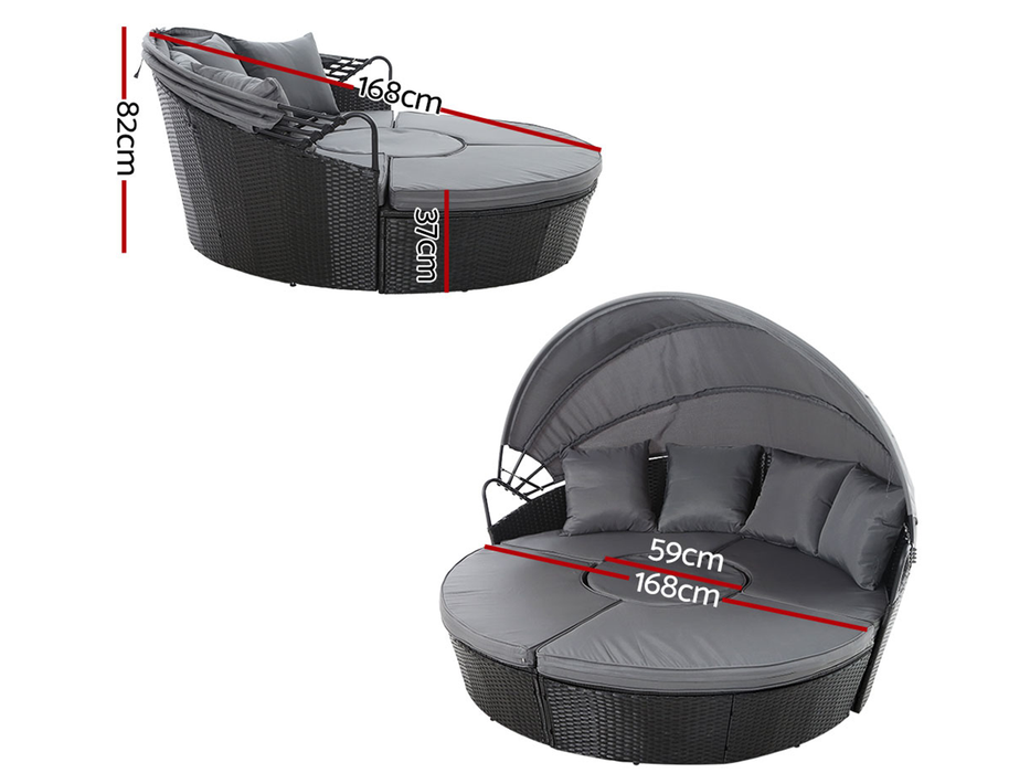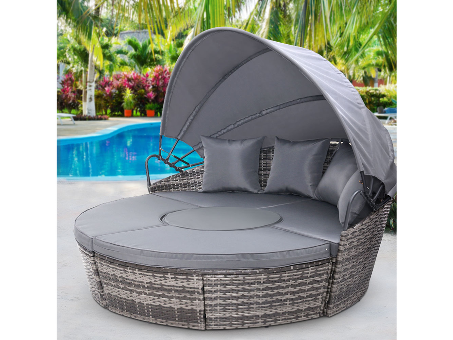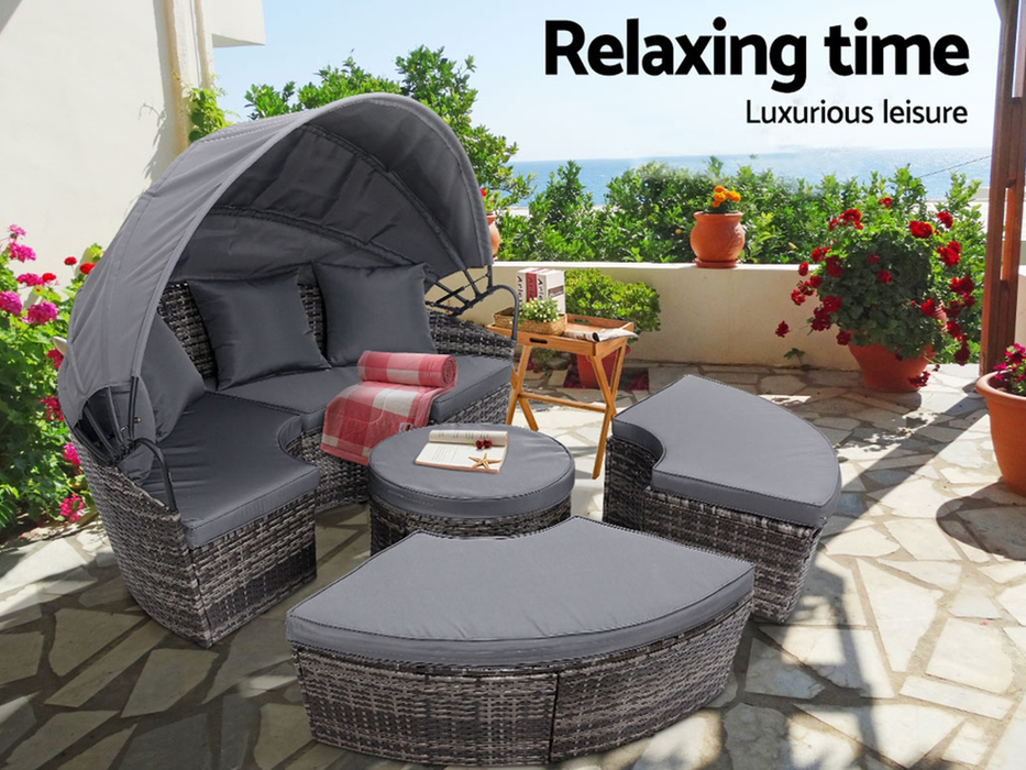 Live life in a perfectly relaxed setting with our Outdoor Day Bed. Built to exacting standards of durability and workmanship, the day bed a joy to use. Especially with its canopy that can be folded down when sunbathing or opened up to 900 to keep your chill-out moments well shaded from direct sunlight and intruding UV-rays. The day bed has a modular design and the base splits into four pieces so that you can alter the arrangement as you please. Put all four together to use as bed or separate to use as a sofa and individual seating. Constructed from heavy-duty powder-coated galvanised steel, hand-woven UV-resistant PE wicker and premium water-resistant polyester fabric, the day bed not only looks good but was made to last. Have it indoors or outdoors, for a unique resting spot or as a peaceful reading zone. The seat cushions and four matching throw pillows are extra thick for plush comfort and are easy to clean with removable and washable covers. Lie back with your loved one on our extra-large outdoor day bed and turn an ordinary day into an extraordinary one.