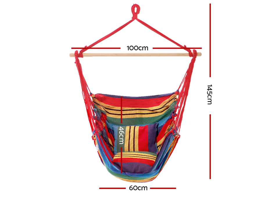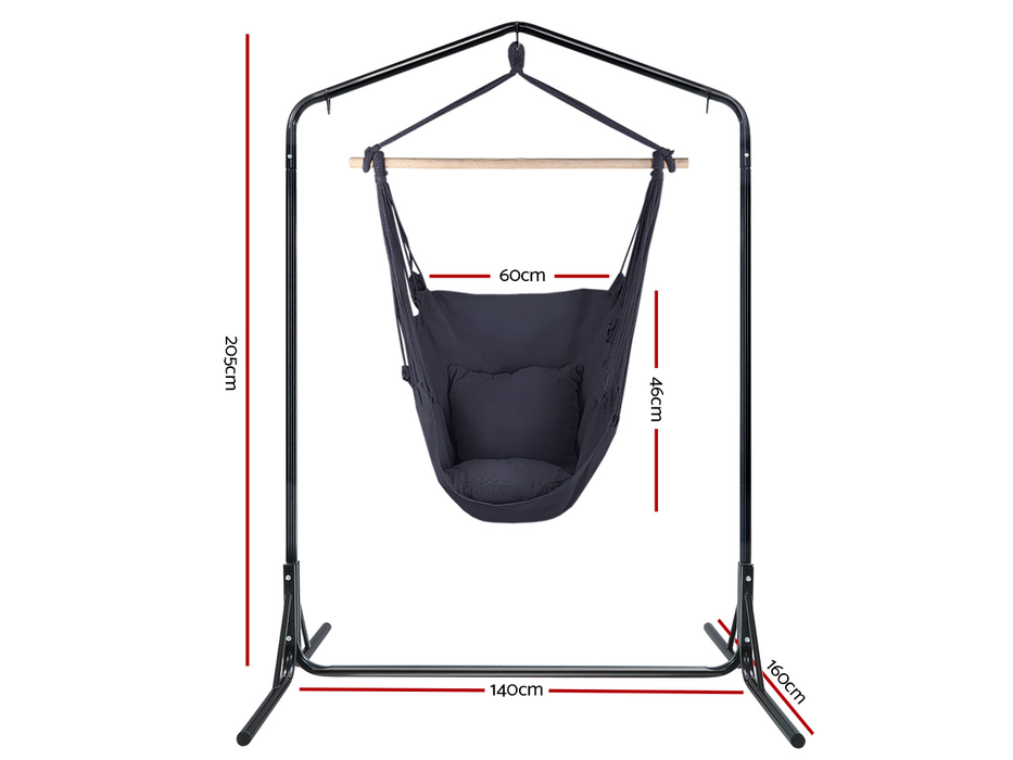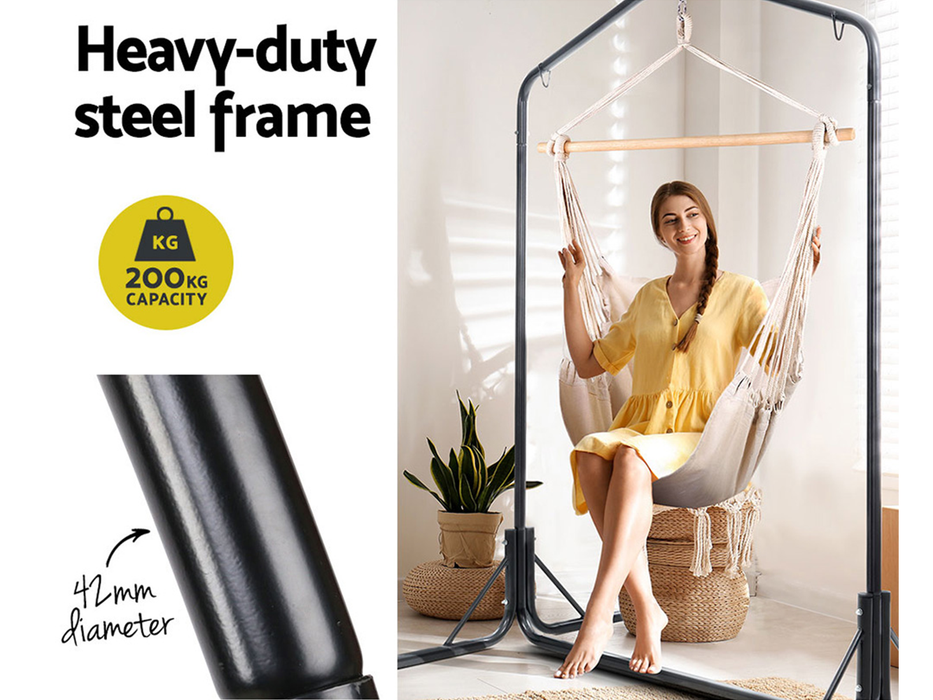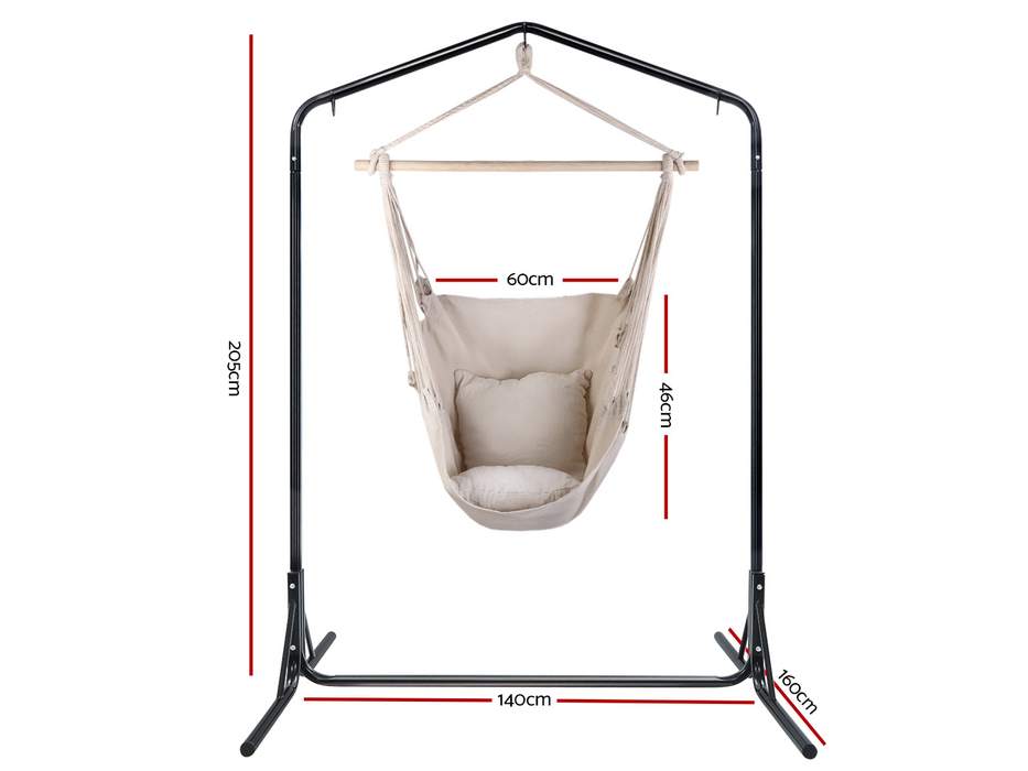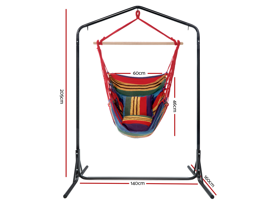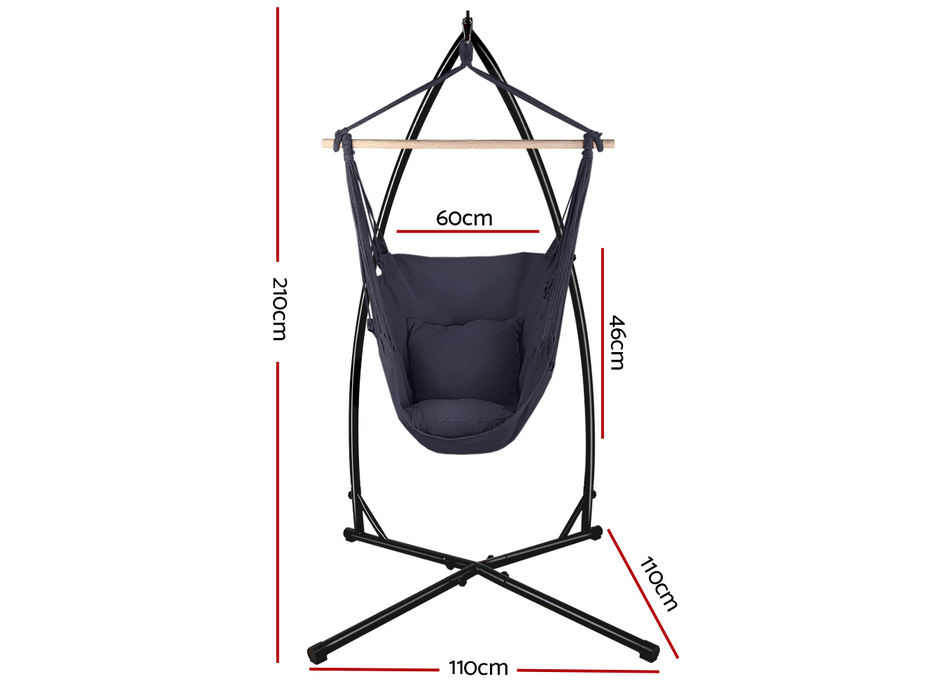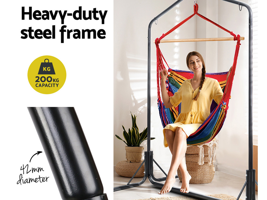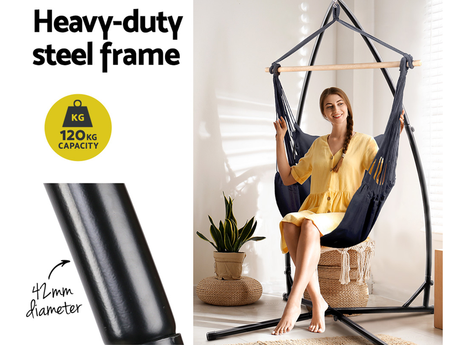 1 x Hammock chair 1 x Hammock Stand (Optional) 1 x Assembly Manual Assembly required: Yes Weight capacity: 120kg Limited 12 month warranty.