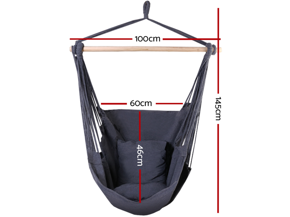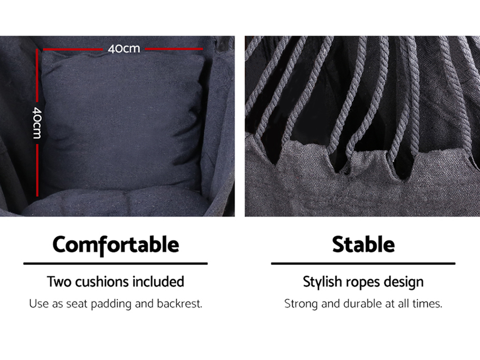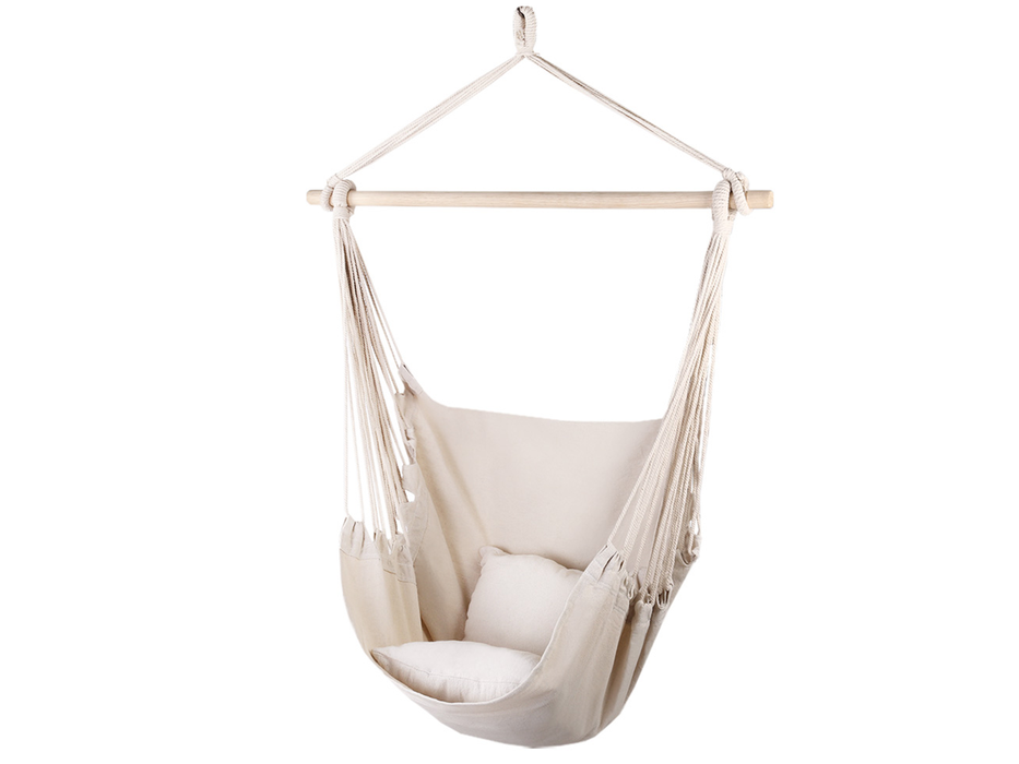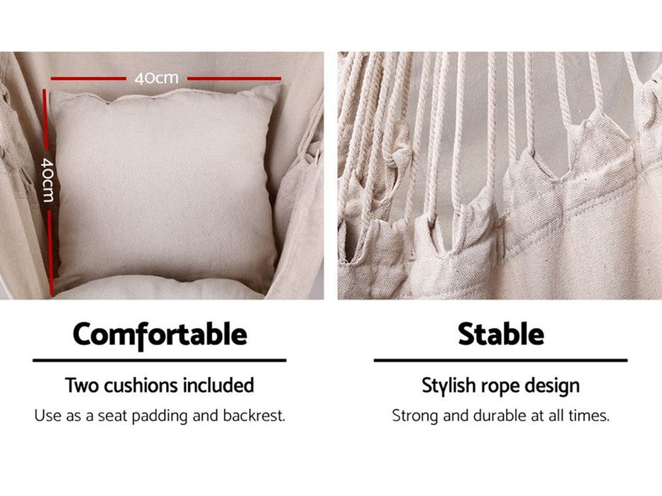 Durable and soft-touch polyester cotton blend fabric Smooth finishing natural timber rail Easy installation with one single attachment point Best way to relax or read a book Suitable for both indoor & outdoor application Powder-coated steel frame 360° rotation for hammock chair Decorations and accessories (like pillows) are not included