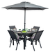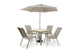 Create a serene retreat in your own backyard with the Shayla 6-Piece Outdoor Umbrella Table Set – where contemporary design meets effortless outdoor comfort. Crafted for al fresco dining and long afternoon conversations, the Shayla set brings resort-style elegance to your patio, balcony, or garden. With sleek lines, soft curves, and a neutral colour palette, this ensemble blends seamlessly with lush greenery and modern architectural backdrops.