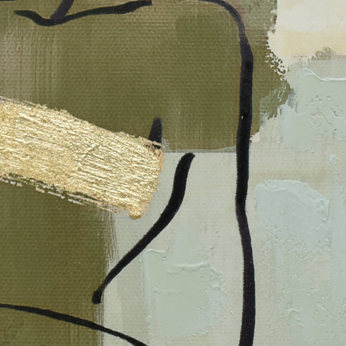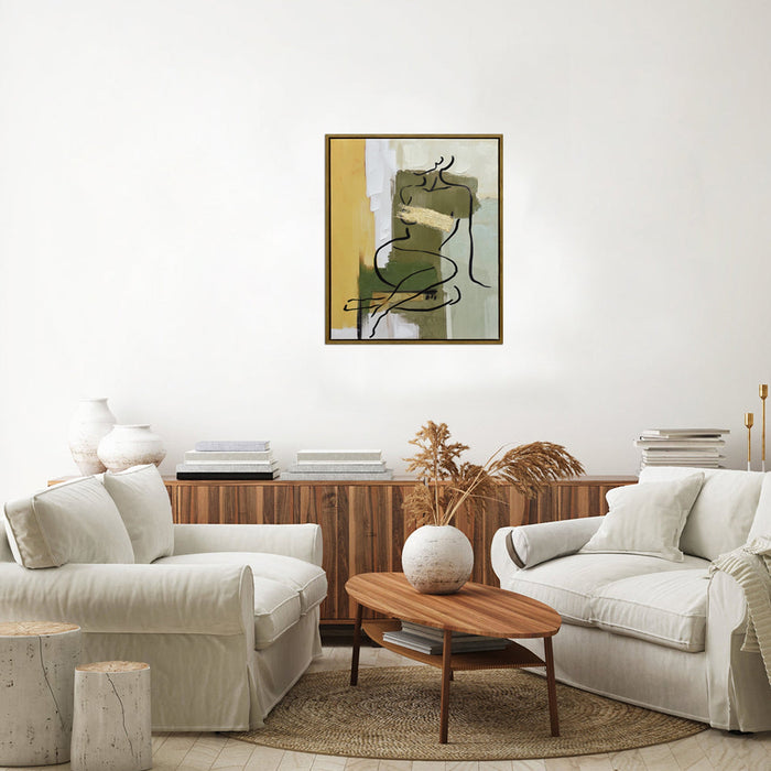 Description "Golden Veil" is an evocative piece that marries abstraction with figuration, capturing the raw essence of femininity. The background is a harmonious blend of vertical shades, ranging from the warmth of yellow and beige to the cool tones of cyan and green. This serene backdrop sets the stage for the striking silhouette of a woman, outlined in bold black. Poised gracefully, her figure exudes confidence and allure. Yet, what truly captivates is the thick dash of gold paint, both concealing and highlighting her form, acting as a veil of honor and strength. Encased in a dark wood frame, the artwork is a testament to the beauty of contrasts — between colors, between the seen and the unseen, and between vulnerability and power. Crafted with a blend of hand-painted and printed techniques, "Golden Veil" beckons viewers to delve deeper and appreciate the complexities of the female form.