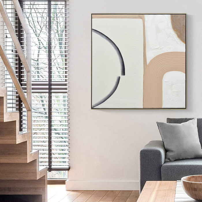 "Duality Dance" captures the essence of contrasting elements harmoniously coexisting on a single canvas. On the left, a semi-circular 3D expanse rests on a pristine white background, its border boldly defined by jet black, signifying strength and stability. The right side introduces a delicate interplay of white and pastel, bringing forth a sense of serenity and grace. This duality is accentuated by a uniquely grooved, U-shaped texture on the bottom right, adding depth and intrigue to the composition. Each stroke, meticulously hand-painted with 3D materials, invites viewers to experience the artwork both visually and tactilely. Encased within a champagne-hued frame, "Duality Dance" stands as a testament to the beauty of balance and the dance between strength and softness.