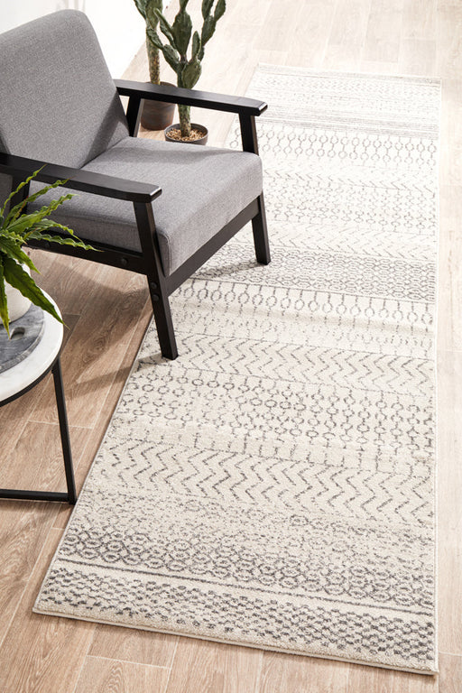 View full detailsMagnificently monochromatic, this silver and white palette is adorned with a floral trellis design. Power loomed with a polypropylene pile, this ru...