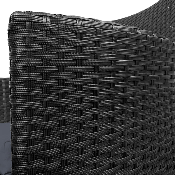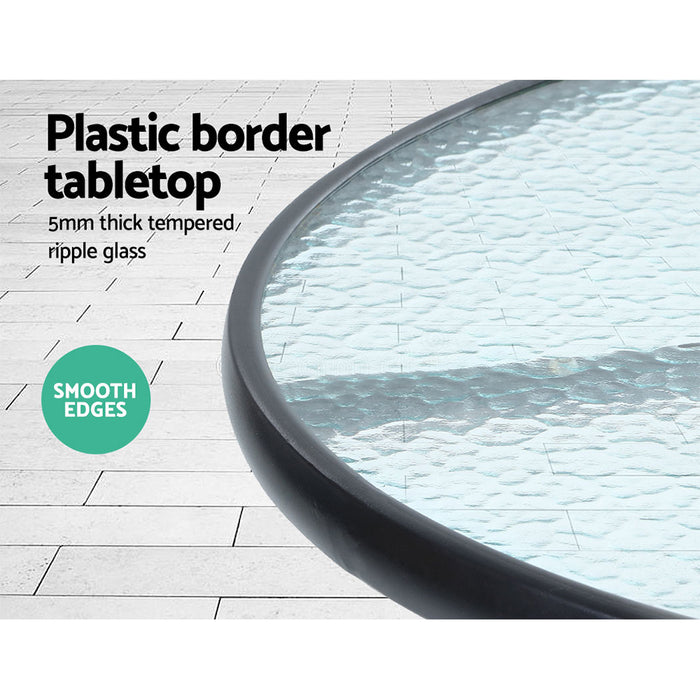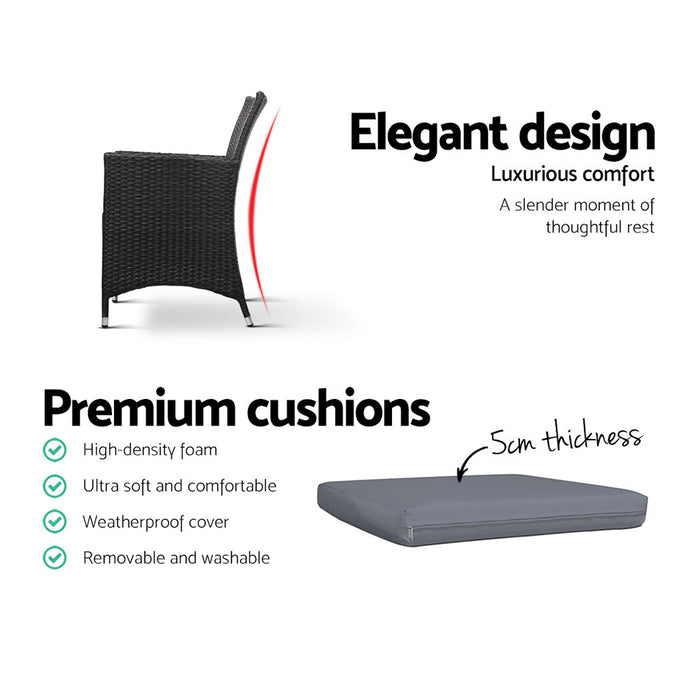 Enjoy the pleasant outdoors or have a nice chat with friends over a cuppa with our Outdoor Bistro Set. With its chic and trendy profile, the set comes with a glass-top table and two wicker chairs. The elegant table is stunning in looks and equally as functional. The thick steel frame makes it durable and the 5mm thick tempered ripple glass does not only look stylish, it is easy to clean. Plus, there is a built-in hole for your parasol for you to relax outdoors for as long as you like during the hot summers without the fear of getting sunburnt. The chair is finished in meticulously weaved UV-resistant and weather-resistant PE wicker with a strong and sturdy steel frame construction. The exotic design, spacious seating and 5cm thick high-density foam cushions ensure comfort and style are always in place. Best of all, the removable and washable seat cushion cover makes cleaning up hassle-free. Together, the set is designed to please as well as stand up to the weather elements and the non-slip feet make the set suitable for use in even the most slippery of situations. With so much going for it, the bistro set certainly deserves its coveted space in your lovely backyard, deck or patio. Or even indoors for a unique presence.