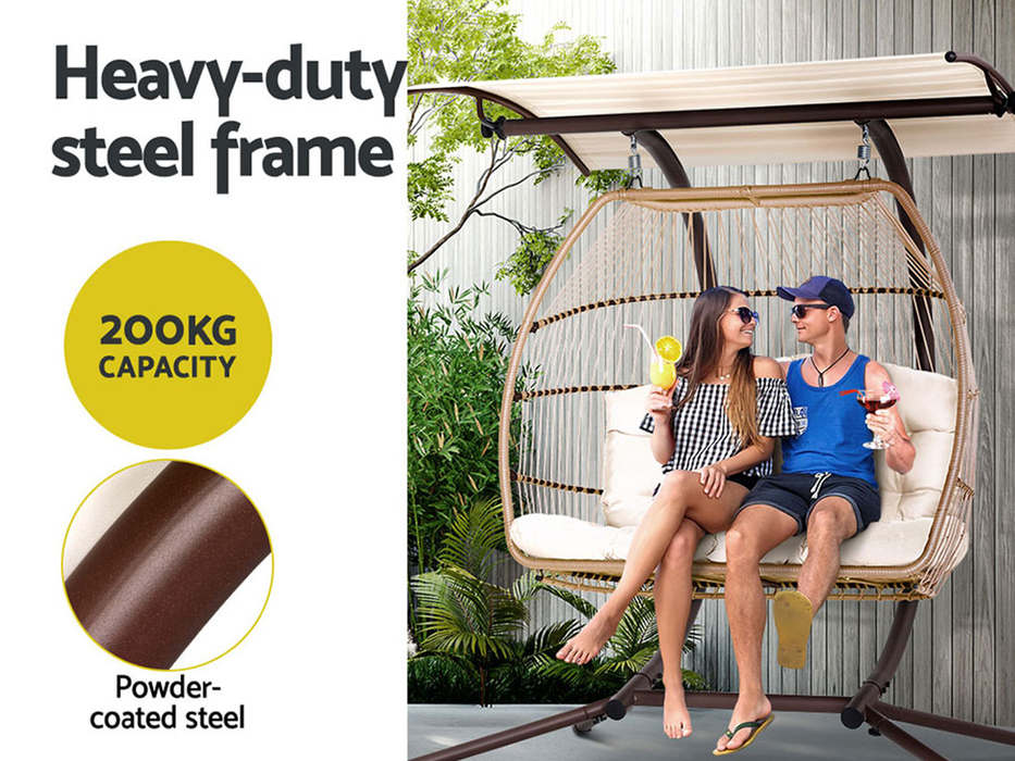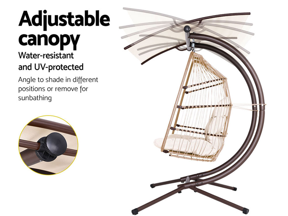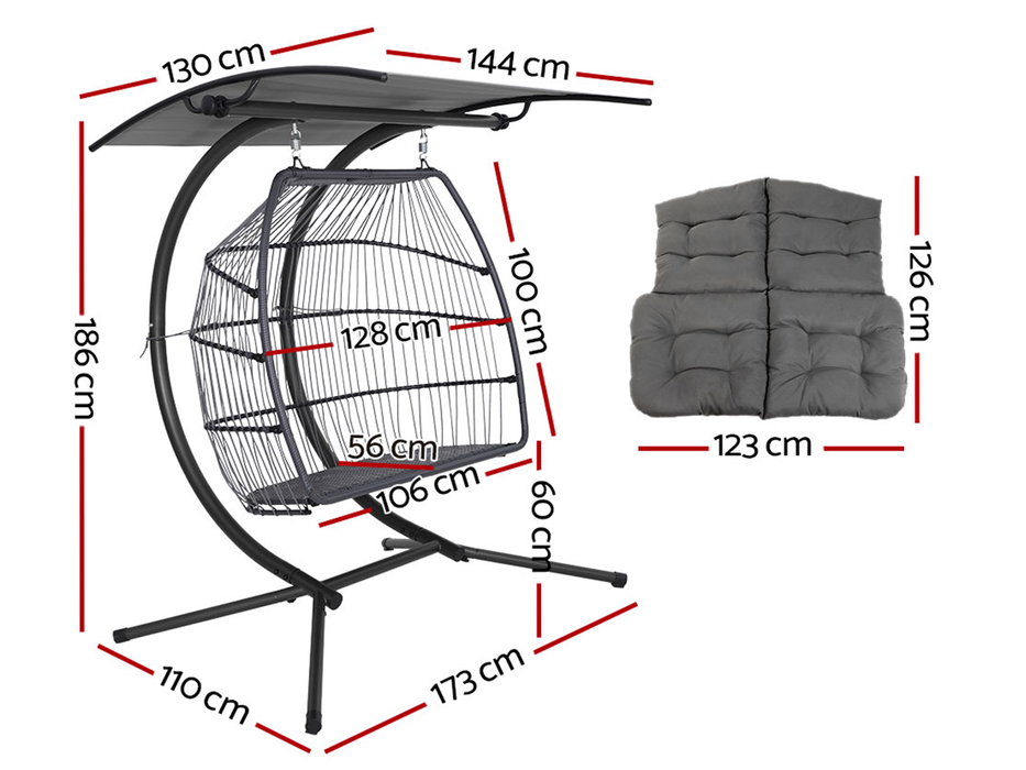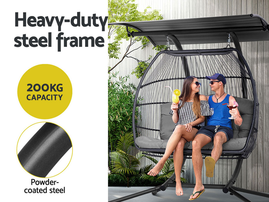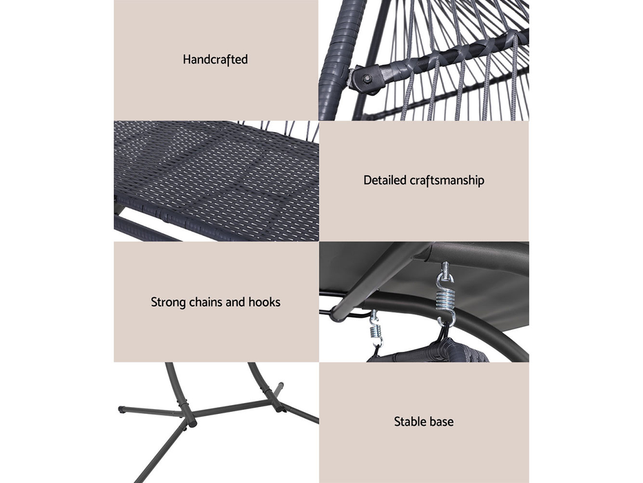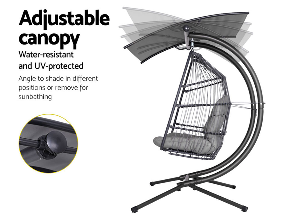 Otherwise known as the hanging egg chair, our Cantona Hanging Swing Egg Chair is the epitome of ultimate relaxation with a cool and exotic vibe. With its 100% hand-woven UV-resistant resin wicker, the pod chair is beautifully handcrafted and well hung on a steel pole for stability and strength. Plus, the adjustable canopy can be angled to suit your shading or completely removed for a wondrous tan. The powder-coated steel frame finish ensures that corrosion will never be an issue while the soft, fully-padded cushioned seat offers plush comfort for daydreamers and leisure seekers alike. Best of all, it seats two and has ample space for relaxation with a weight capacity of up to 200kg. Sit back with your loved one and turn an ordinary day into an extraordinary one. Hang cool people!.