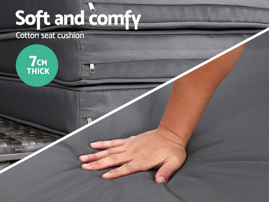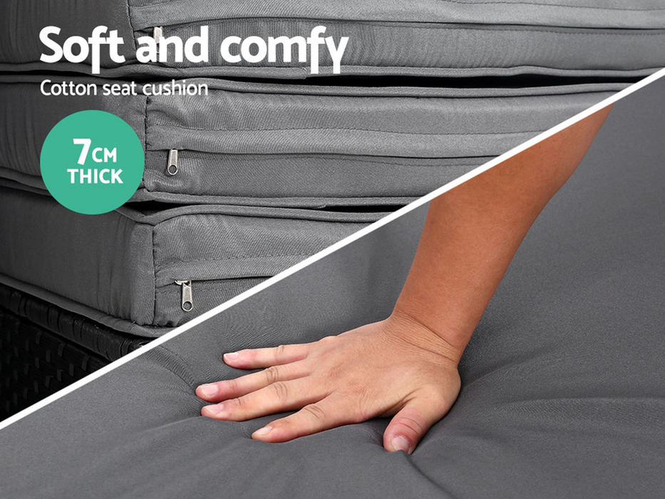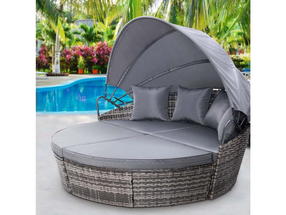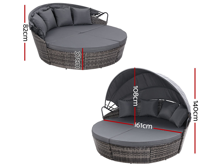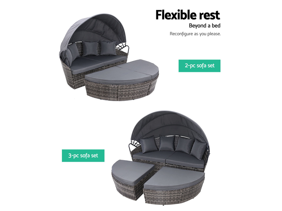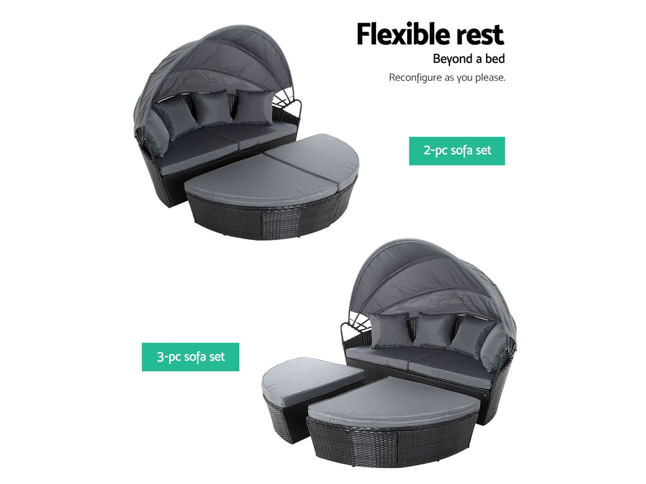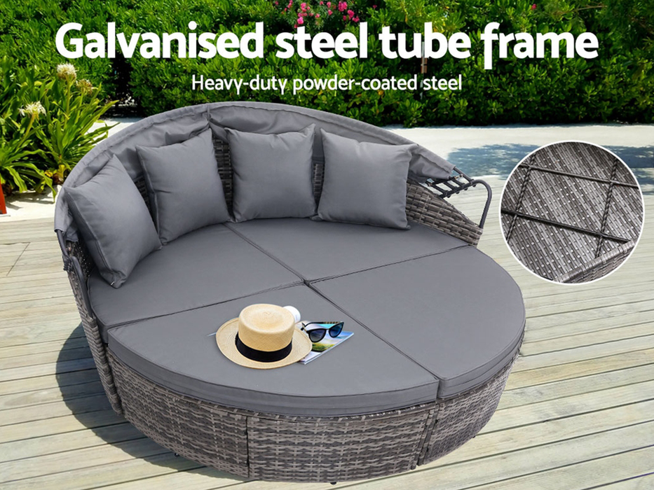 Live life in a perfectly relaxed setting with our Outdoor Day Bed. Built to exacting standards of durability and workmanship, the day bed a joy to use. Especially with its canopy that can be folded down when sunbathing or opened up to 900 to keep your chill-out moments well shaded from direct sunlight and intruding UV-rays. The day bed has a modular design and the base splits into four pieces so that you can alter the arrangement as you please. Put all four together to use as bed or separate to use as a sofa and individual seating. Constructed from heavy-duty powder-coated galvanised steel, hand-woven UV-resistant PE wicker and premium water-resistant polyester fabric, the day bed not only looks good but was made to last. Have it indoors or outdoors, for a unique resting spot or as a peaceful reading zone. The seat cushions and four matching throw pillows are extra thick for plush comfort and are easy to clean with removable and washable covers. Lie back with your loved one on our extra-large outdoor day bed and turn an ordinary day into an extraordinary one.