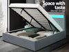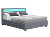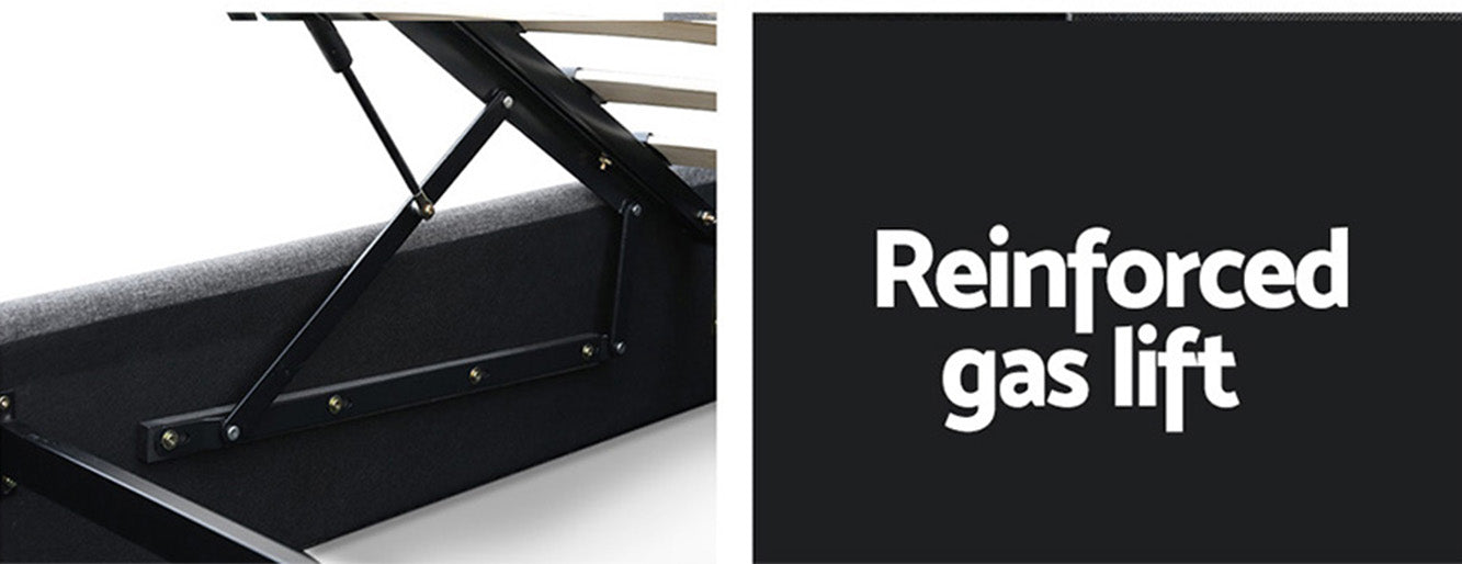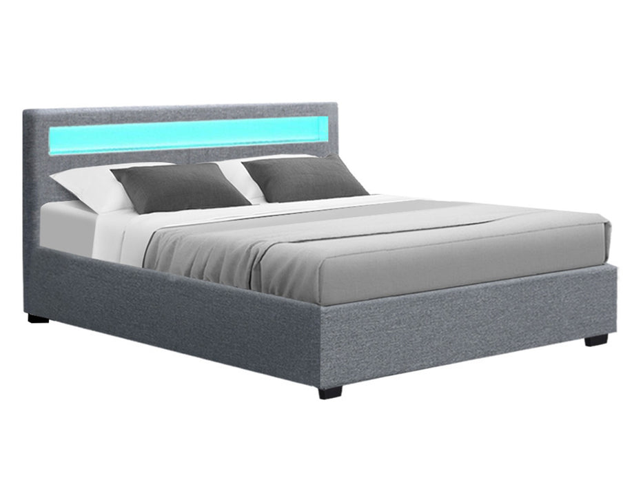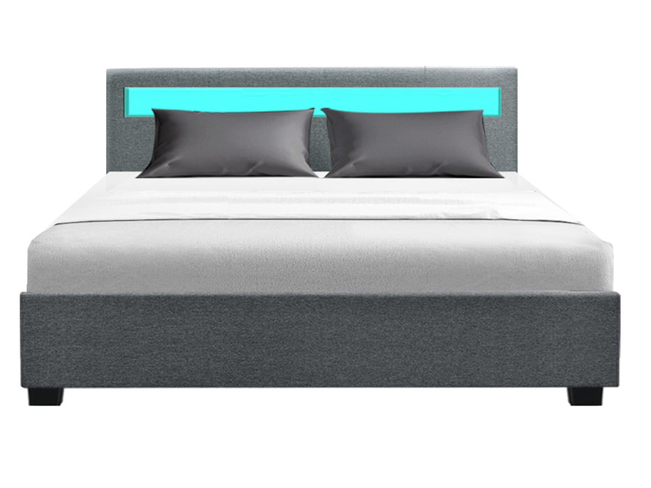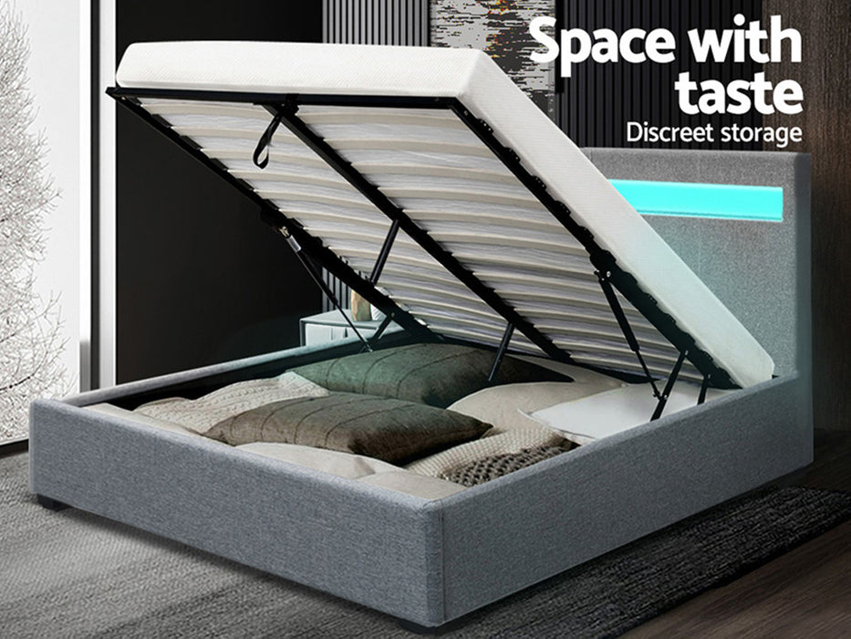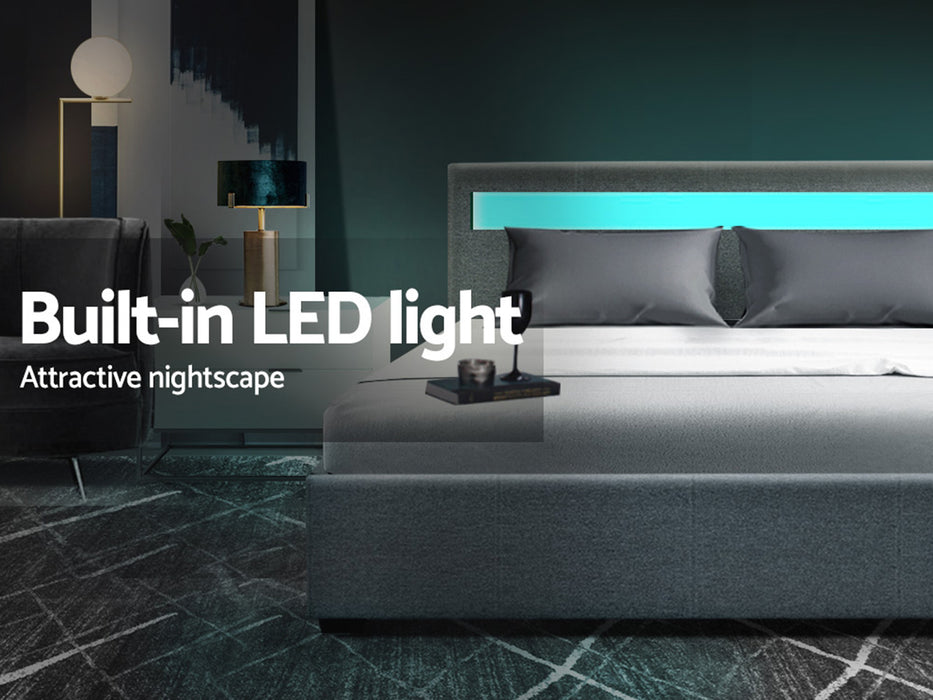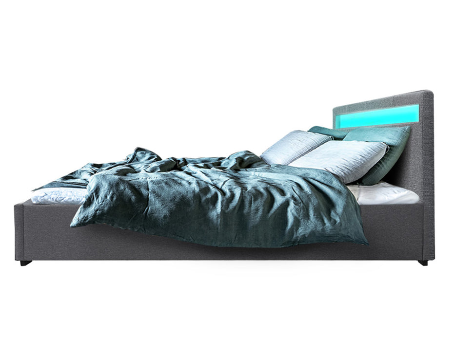 When is a bed more than a bed? When it uses our Clara Fabric LED Lift Bed. On the outside, this bed frame looks like just any other quality bed frame. Beautifully padded with generous foam and covered in faux linen fabric. Strong steel frame with high grade steel centre rails, heavy-duty bars and arched slat base. Large and comfortable headboard. But with one easy gas lift of the bed base, the bed frame becomes an instant storage area with acres of space for your bedding essentials. Simply store your extra pillows, bed sheets, cushions and more in the storage compartment and hide them away for the season. Even better, you no longer have to fumble in the dark for a light switch in the middle of the night with this bed frame. It comes with built-in LED lighting that can be customised into 16 different colours and 4 flashing modes to suit your preference. Not only will the illuminated bed frame create a beautiful ambience, it will also save you from buying extra bedside lamps or nightlights. So do not just get any bed frame, get this 3-in-1 bed frame to expand your home storage capacity and light up your nights with just a lift of your hands.