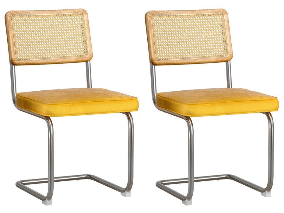 Enhance your dining experience with the Evelyn Dining Chair Set. Crafted with a cantilevered stainless-steel frame, these chairs offer a sleek and modern look that will complement any dining space. The rounded edges add a touch of elegance, while the rubberwood frame ensures durability and stability. The chairs feature a woven PE rattan backrest, allowing for adequate ventilation throughout the dining experience and providing both comfort and style. The velvet padded seat, filled with high-resilience foam, offers a plush seating experience. With anti-slip feet, these chairs provide stability and prevent any unwanted movement. Additionally, the easy assembly process allows you to enjoy these chairs in no time. Upgrade your dining area with the Felix Dining Chair and indulge in both comfort and sophistication.