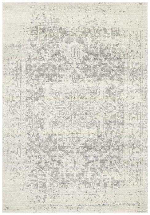 Bring out the beauty and elegance with a touch of global inspiration with this head turning, eye catching pile. The Evoke Dream White Silver Rug made from quality polypropylene materials is machine woven in Turkey. It showcases a floral center emblem laid in a gray hue context, with duly imposed serge edges of interloping white yarns adding more value and durability to the product. Definitely high chic and can withstand well-traveled areas.