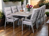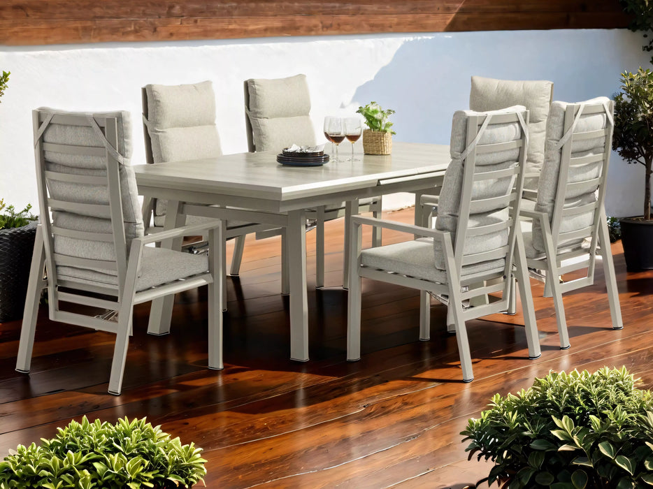 At the heart of this set lies the extendable table, topped with a luxurious 10mm thick ceramic surface, offering both beauty and practicality. The ceramic is remarkably easy to maintain and resists the rigours of outdoor use, making it perfect for both intimate family dinners and larger gatherings. The sleek grey tones and clean lines of the design integrate seamlessly into a variety of outdoor decors, from contemporary to classic, enhancing the natural beauty of your garden or patio space.
