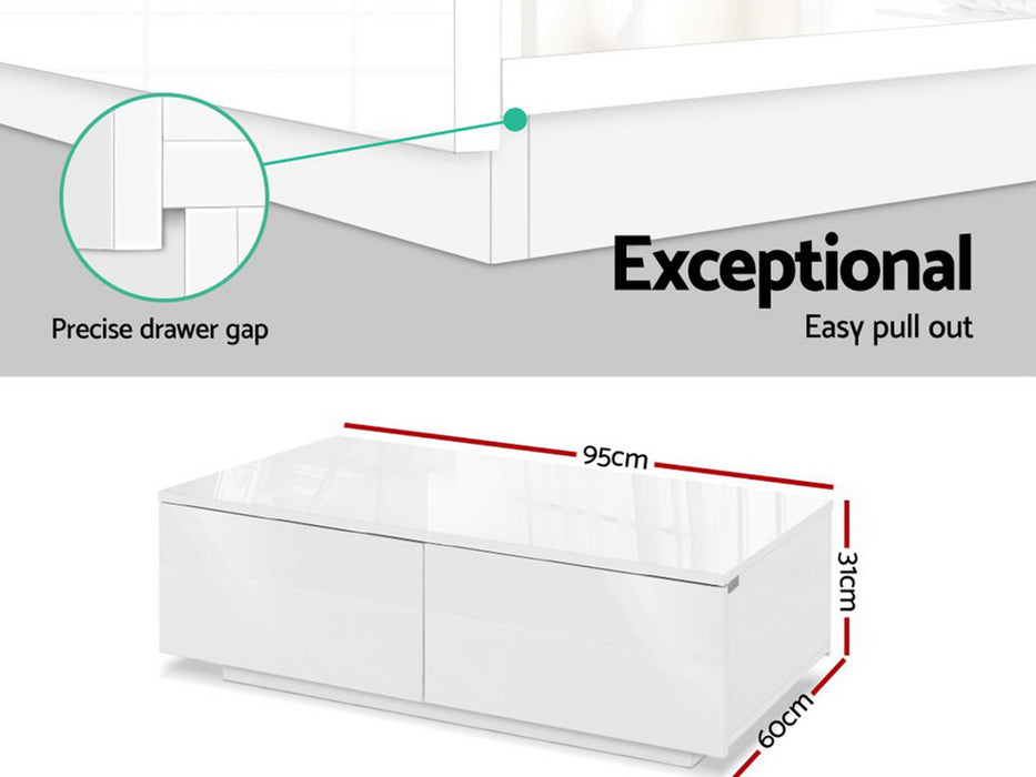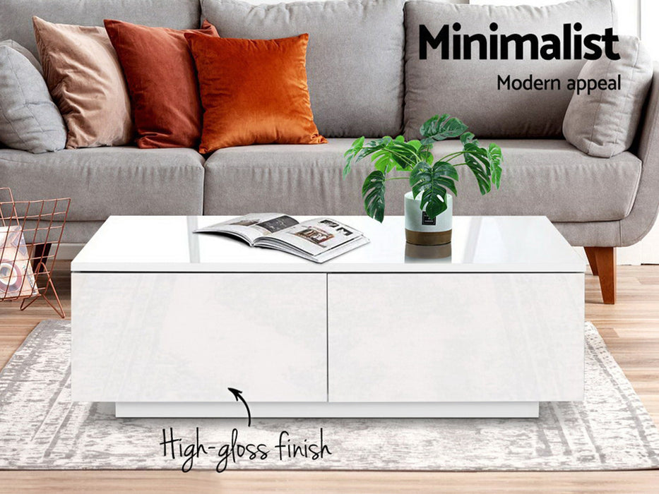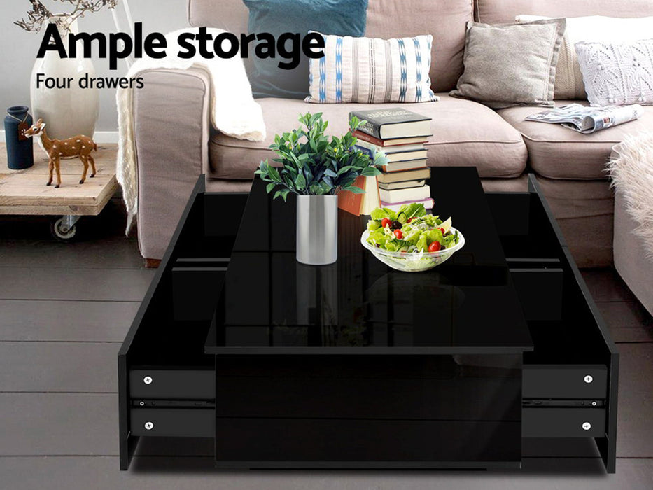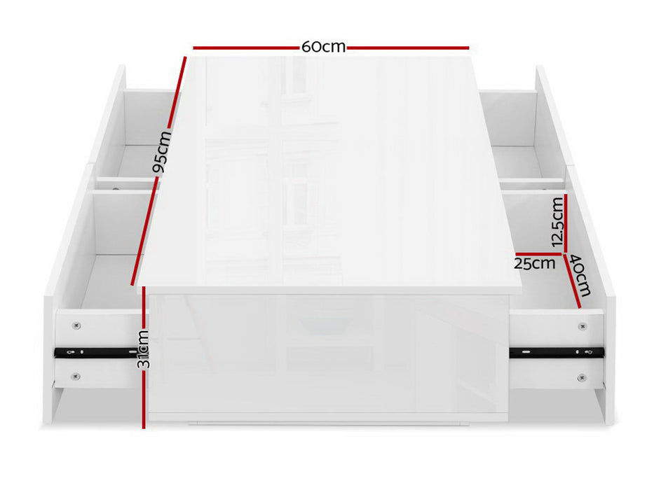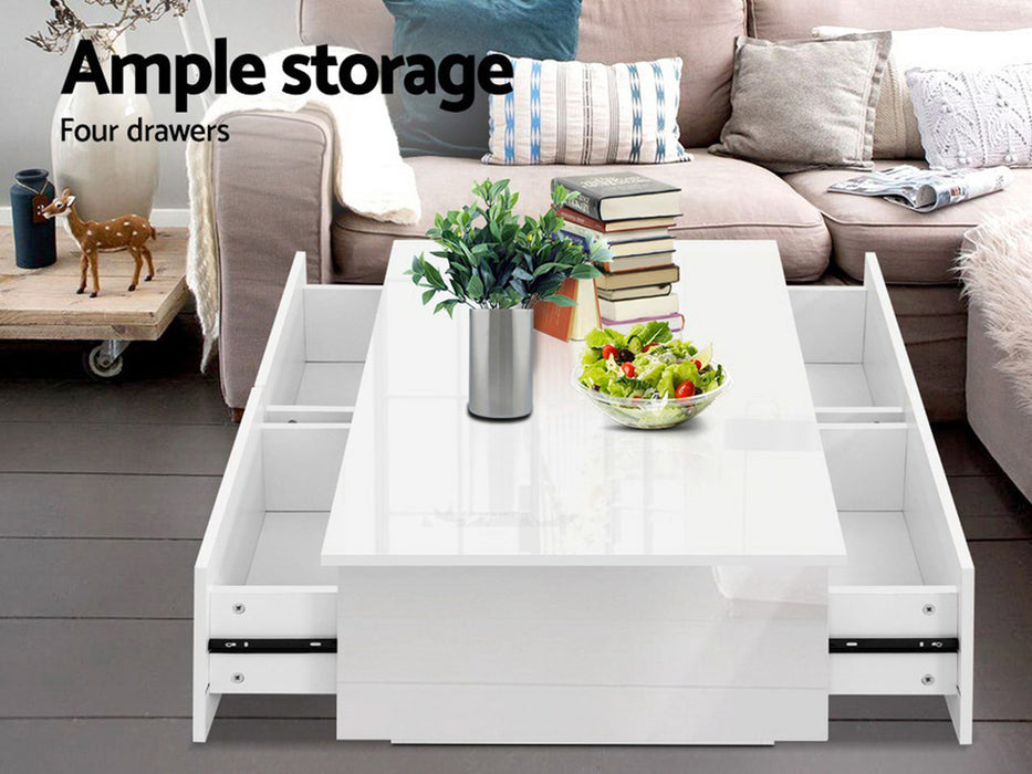 Keep all your books, magazines, remote controls and other entertainment paraphernalia from cluttering up your living room with our Francis Coffee Table. Four drawers, with two on each side, provide flexibility and ample storage space for all your necessities. The longer drawer boards and anti-rust runners also allow for a smooth and hassle-free operation at all times. The table is not only practical but also stylish with a handle-less design to maintain a sleek appearance. The contemporary and linear design means that the table will be the perfect addition to your modern living room. Or any other room, for that matter. Made of quality particle board, the table is built to last. And the UV high-gloss finish not only makes the table attractive, but also easy to clean.