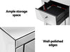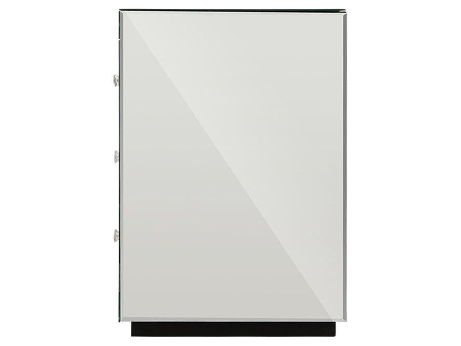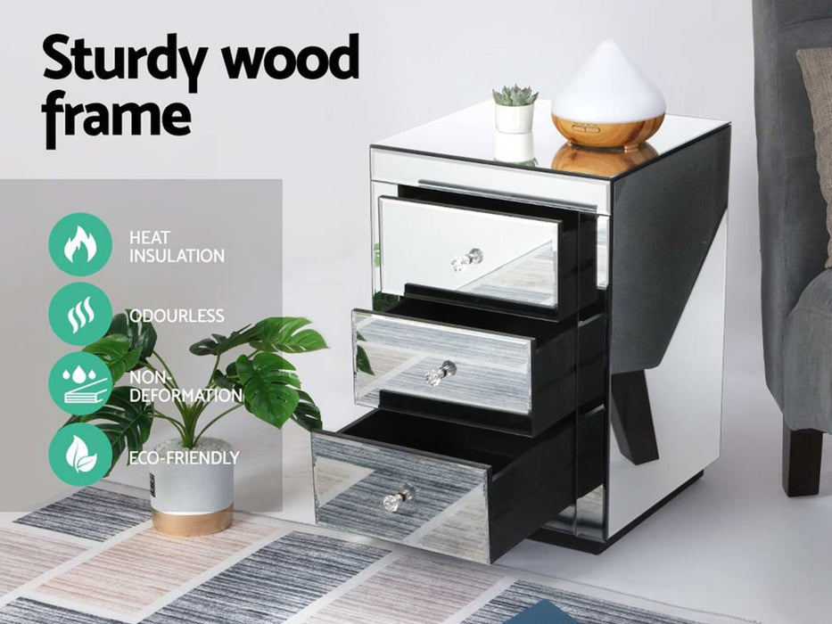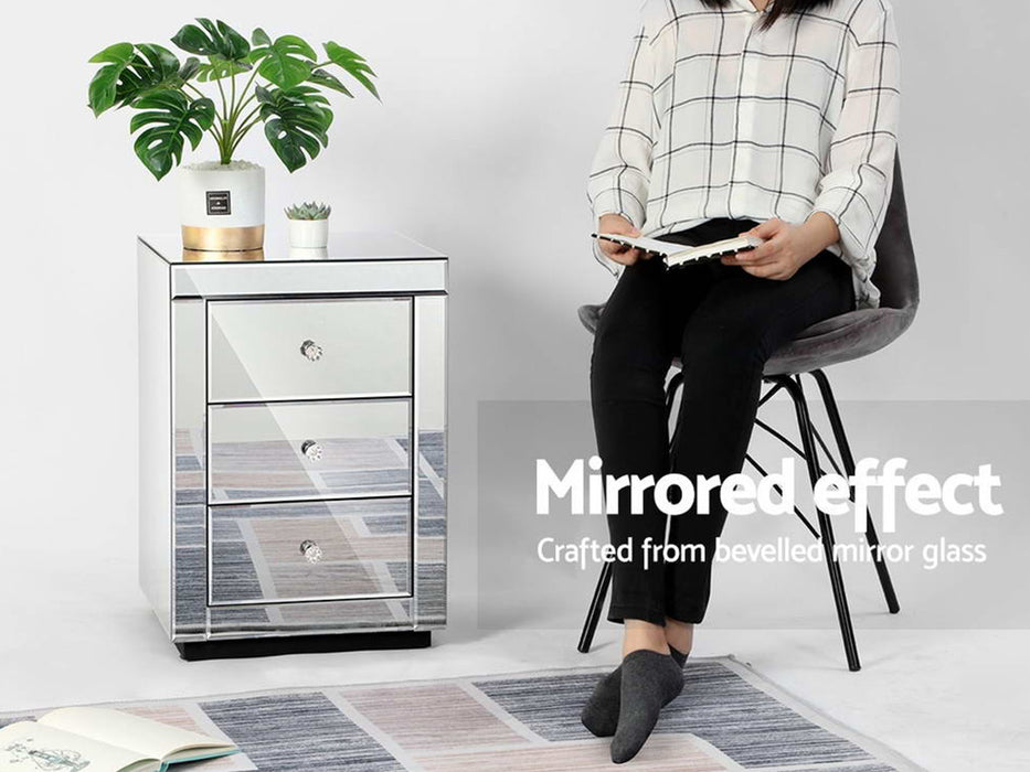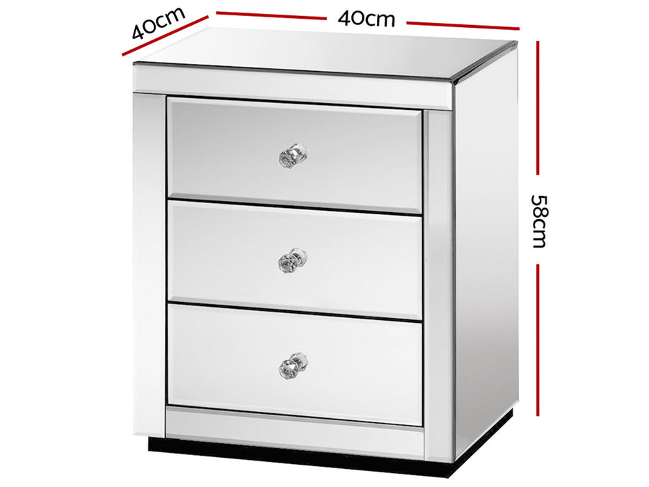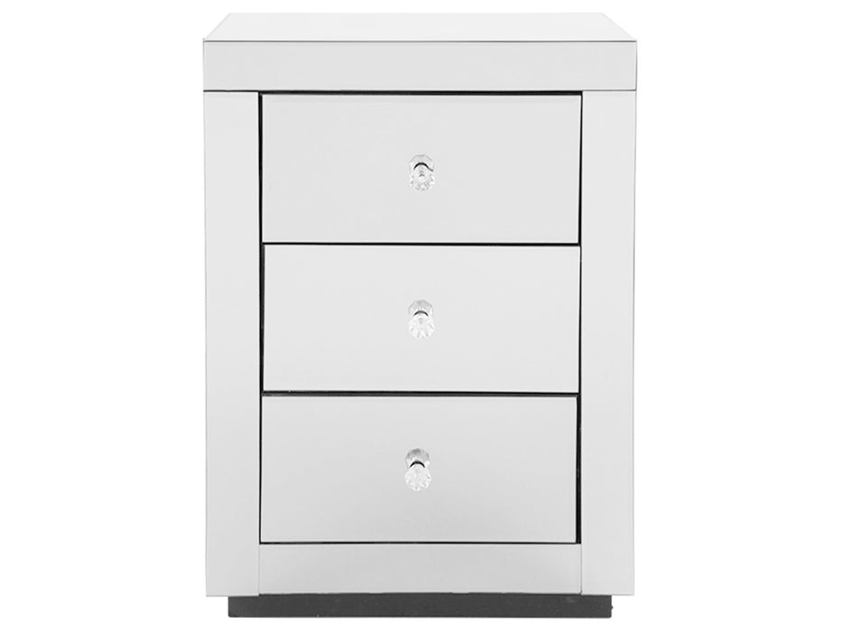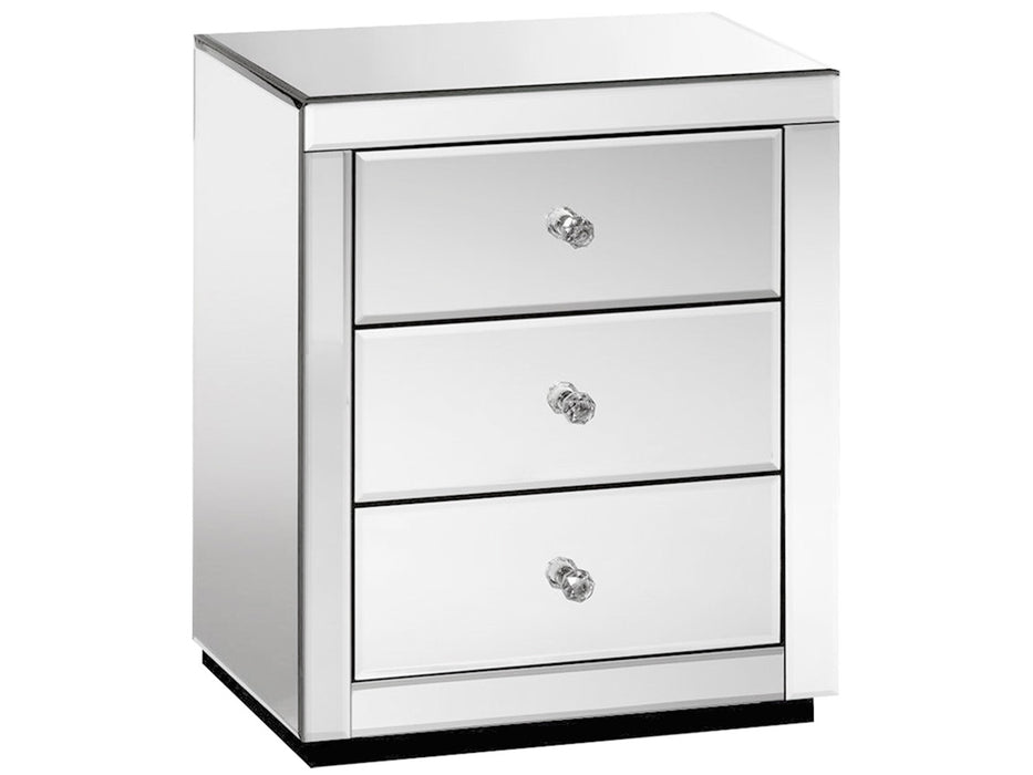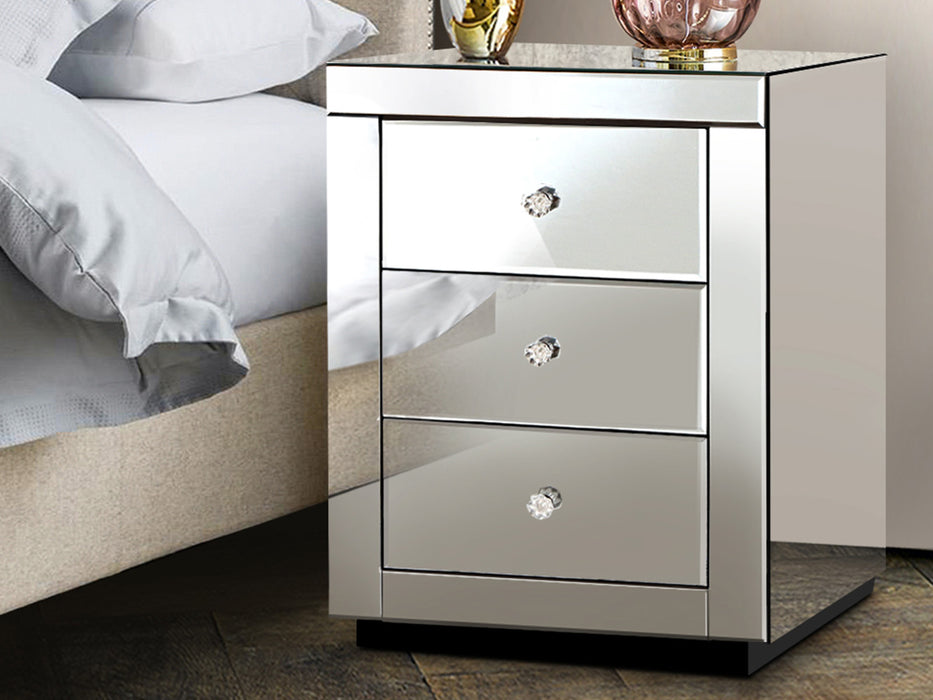 Enjoy all the glitz and glamour that comes with the Minotte Bedside. Cladded with bevelled mirror glass and a durable E1 grade MDF board frame, the elegant drawers are simply stunning from any angle that reflects its mirrored beauty. Plus, the effect also gives your room a larger-than-life look of space and size. The three drawers offer ample storage space and are fitted with coated metal sliders for smooth operation. Not least, the crystal glass effect handles also add a scintillating touch to the drawers with an exquisite appeal. Easy to maintain and clean, our bedside drawers is all about grandeur living made simple.