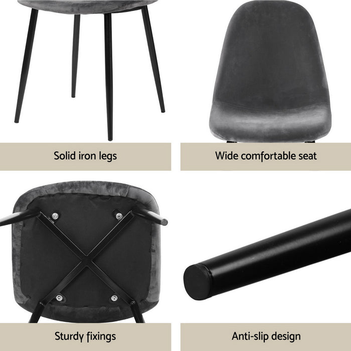 4 Dining Chairs Seat material: Velvet Frame material: Iron legs Overall dimension: 45cm x 43cm x 84cm Seat height: 44cm Colour: Dark grey Assembly required: Yes Number of packages: 1