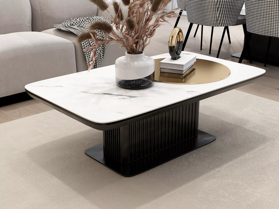 Dining & Occasional Tables: Engineered wood construction with durable, high-gloss white tops and matte black pedestal bases.