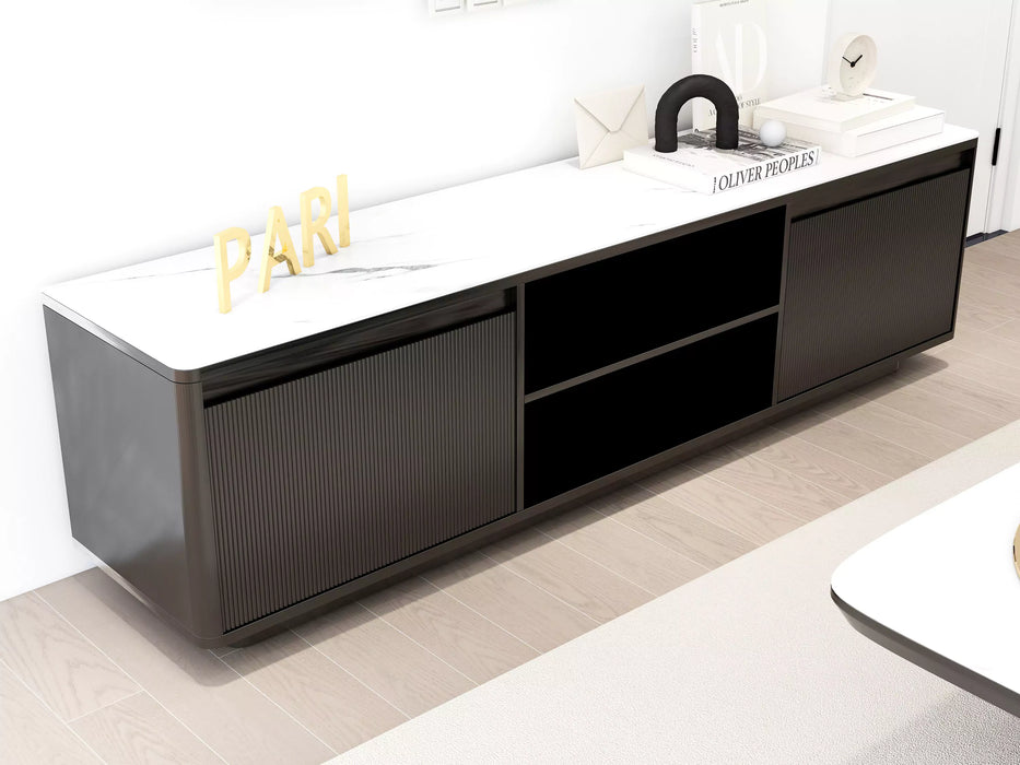 - Wide TV unit offers ample storage for devices, media, and décor with open shelving and concealed cabinets.