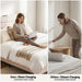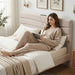 The Queen Bed Frame combines functionality with modern design. Its adjustable headboard features a built-in storage shelf and charging station (2 sockets + USB + Type-C ports), offering convenient power access. Crafted with sturdy pine wood and plywood slats, this platform bed base supports 300kg. The beige linen geometric headboard and 11cm elevated legs provide style and underbed space. Easy assembly included.