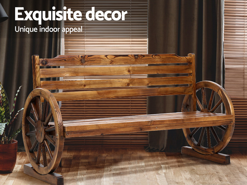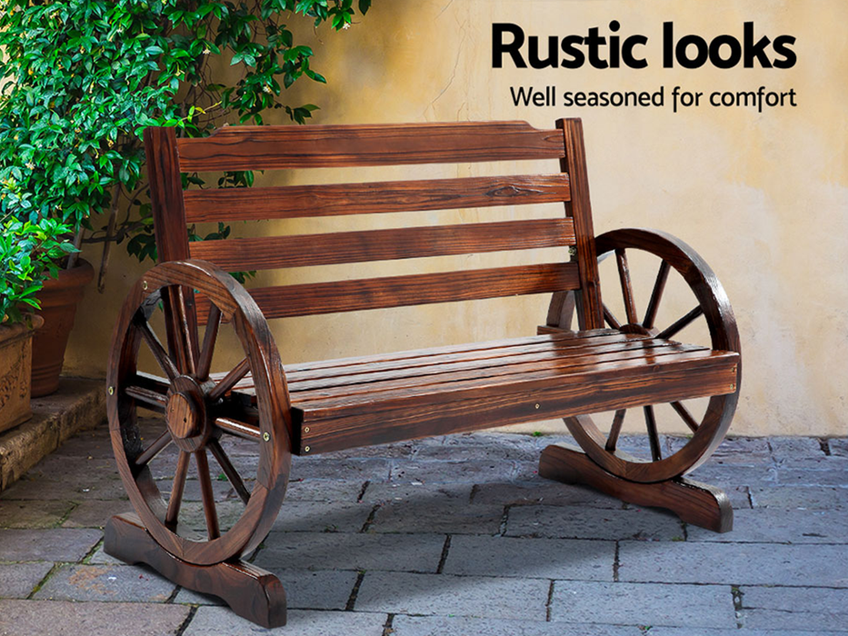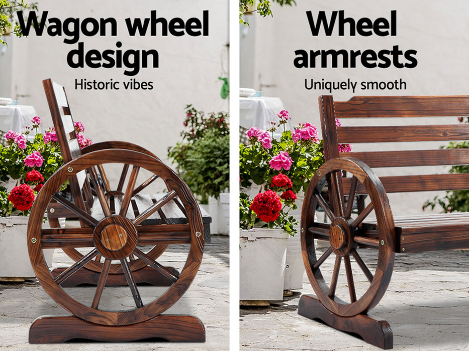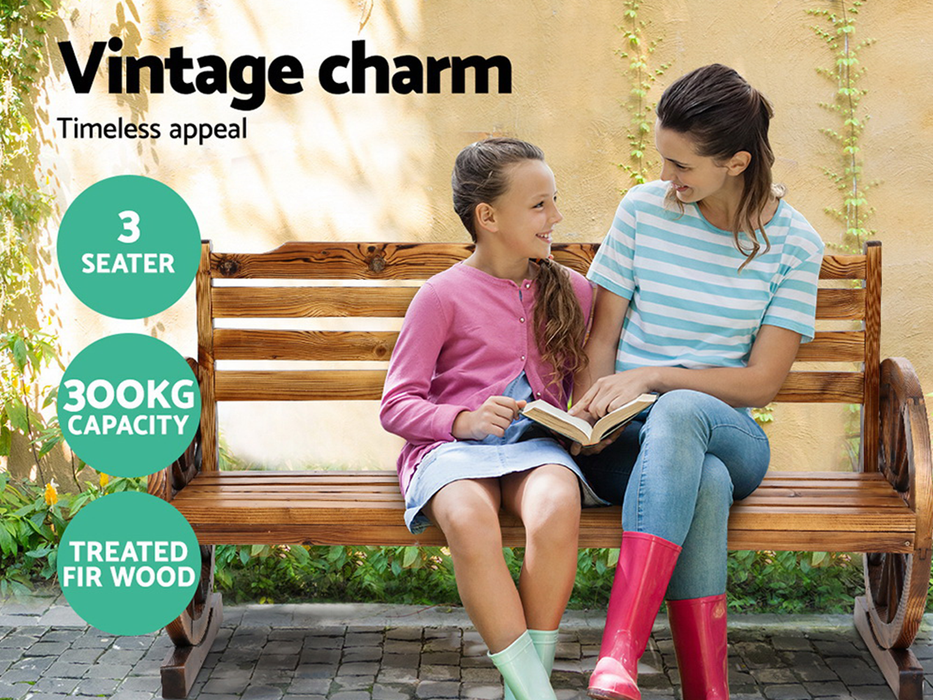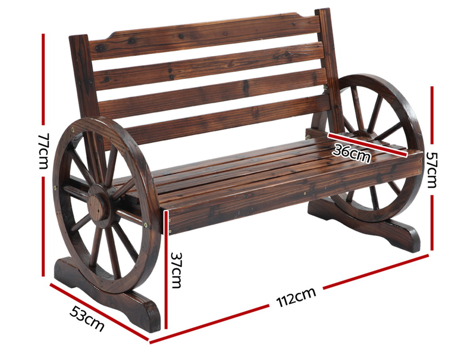 From its period styling to its rustic imported Canadian Fir wood design, the Wagon Wheels Bench is solidly built to seat two persons comfortably. The attention to detail is excellent with finely crafted wagon-wheel armrests, a smooth and supportive backrest and exceptional strength and beautiful grains from the Firwood finish. In fact, the Bench can take on a massive weight of up to 220kg (2 seater) / 300kg (3 seater). Better still, the Firwood is weather-resistant, UV-resistant and blessed with a natural resistance to rot and pests. Everything you want in a durable and long-lasting garden bench under the great Australian sun and rain.