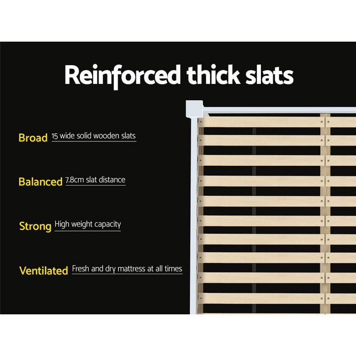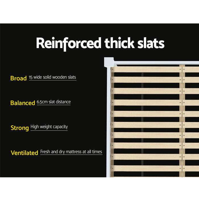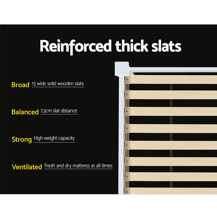 Our collection of wooden bed frames is made from solid pine wood, offering a sturdy and stylish addition to any bedroom. Each bed frame features a durable plywood slated base, reinforced angled brackets for long-term support, a stylish headboard, heavy-duty steel fixings, and smooth edges. Finished in a non-toxic, eco-friendly white paint, these frames are designed to easily coordinate with any bedroom decor. They provide ample space below for optional trundle drawers, making them ideal for both young and old alike.