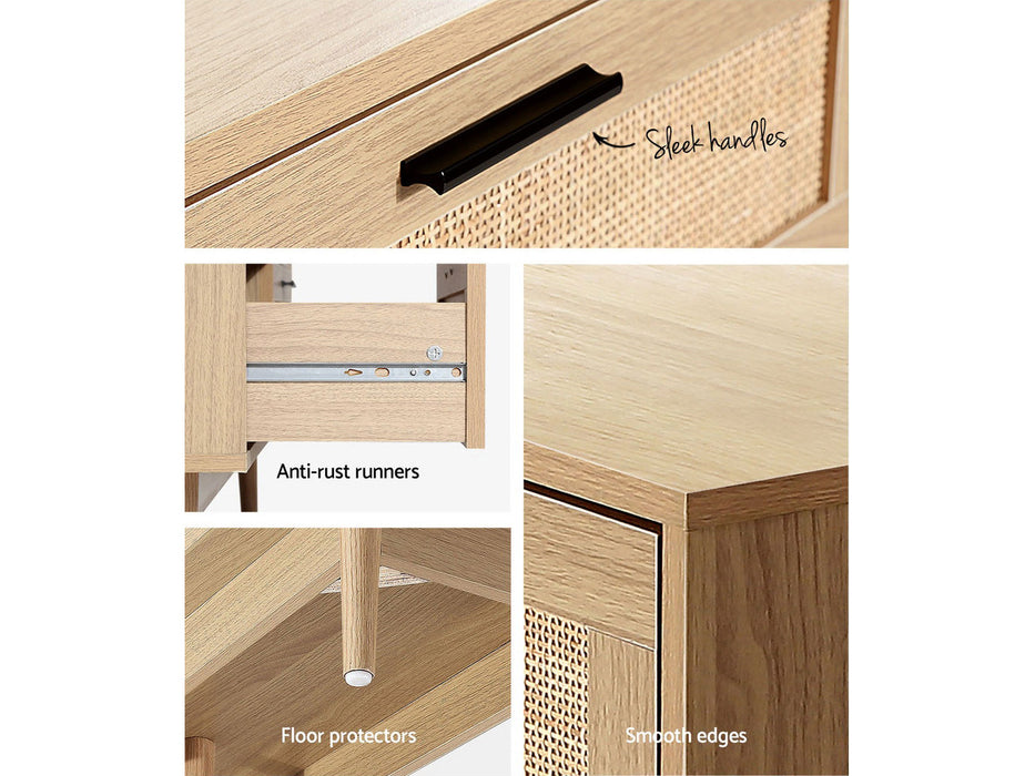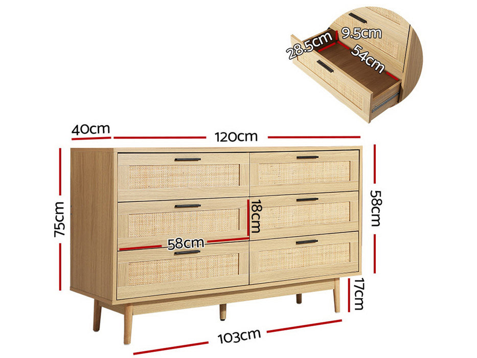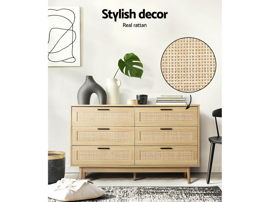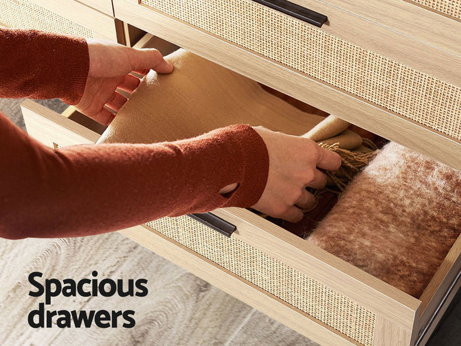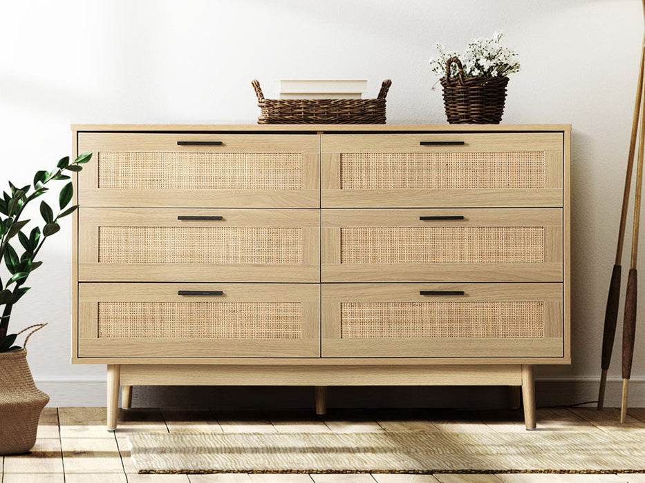 Featuring a beautiful and creative design, this Sienna Rattan Lowboy makes an ultimate upgrade and a perfect addition to your bedroom décor. It will give your space an instant lift without any extra effort with its elegant and stylish appearance. It has six spacious drawers to store your belongings in an organised manner. You can devote a drawer to each group of items and never struggle to find them. It makes life so easy and mess-free. So cut the clutter and tidy up your space with our Sienna Rattan Lowboy. You can even mix and match and style this with our other rattan series furniture. Our real rattan lowboy features sleek handles, great surface smoothness, quality floor protectors to protect your floors from scratching or any other damage, and smooth anti-rust runners for hassle-free operation. Plus, you won’t have to spend a lot of time cleaning and maintaining. Furthermore, it is resistant to decay and rot, offers high stability with extra support leg and can even be painted to suit your home décor. Not least, it is environmentally friendly and easy to assemble.