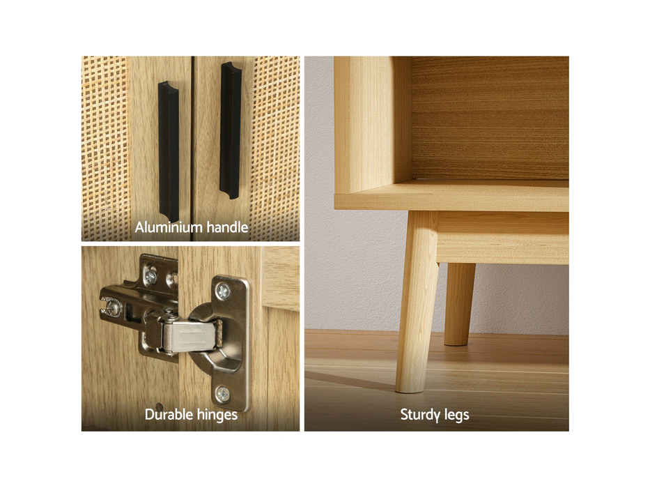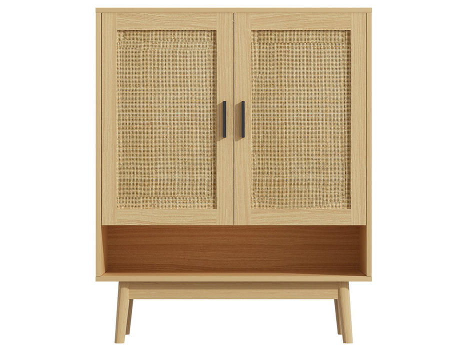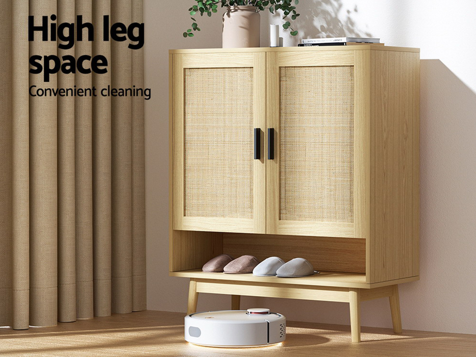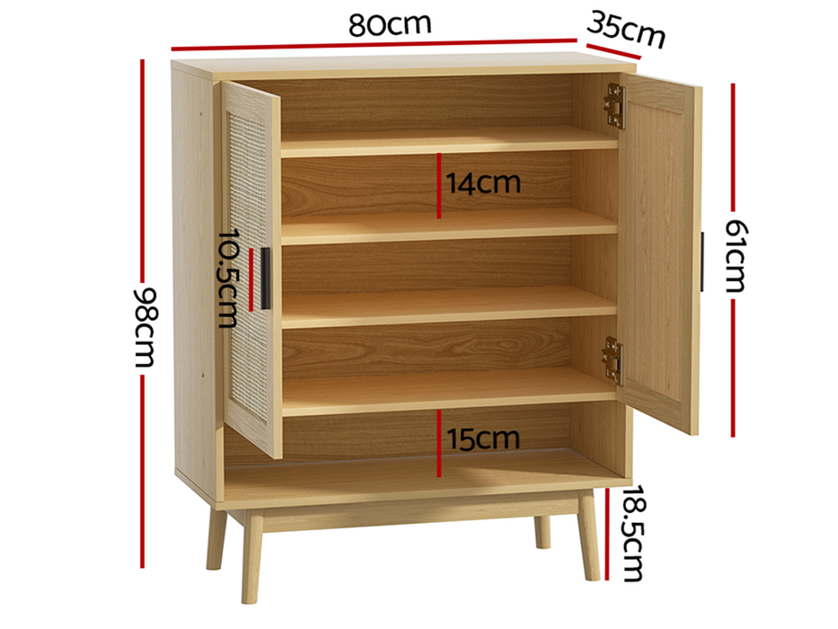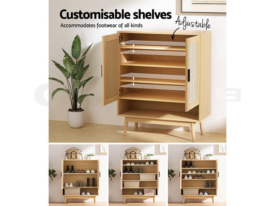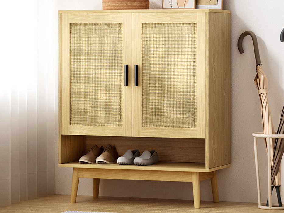 Sneakers, running shoes, flip-flops, boots, high heels, and special-occasion footwear, shoes are never enough! As our shoe collection gets out of hand, your first instinct may be to chuck them on the floor, gradually resulting in a shoe explosion. With our Sienna Rattan Shoe Rack Cabinet, you can keep your beloved shoes organised and prevent them from getting scuffed or looking worn. Featuring meticulous craftsmanship, our shoe storage boasts a sturdy particle board and rattan construction with solid wood legs and paper finish for ultimate durability, stability, and a well-polished look. It comes with accessories for wall attachment to prevent tripping. The shoe storage is suitable for most shoe types and can fit up to 20 pairs of shoes. It has a wide tabletop and five tiers for storage with two adjustable shelves that provides ample space to store your footwear. The beautiful rattan design, thick boards, aluminium handles, sturdy hinges, and other features makes this shoe storage out of ordinary. It's both stylish and practical. Furthermore, it comes in a complete package, and the convenient design makes for hassle-free assembly. Convenient and versatile, get our Sienna Rattan Shoe Rack Cabinet today.