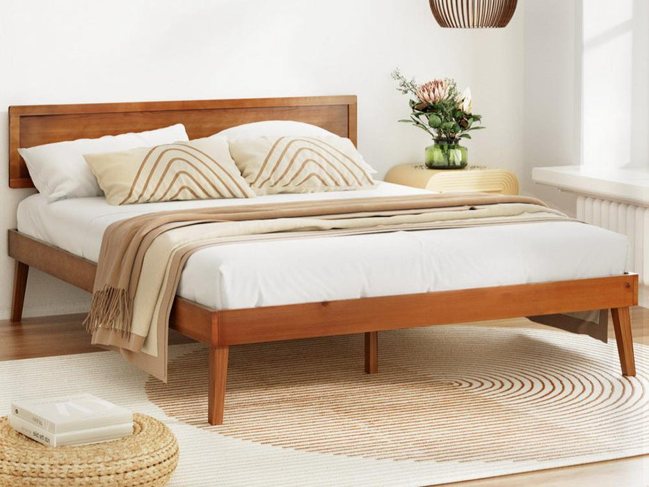 For a simple yet sophisticated bed frame, look no further than the Splay Bed Head. Made from real pinewood, the Splay will give your bedroom a beautiful rustic or traditional-style makeover. The solid pinewood frame is reinforced with high-quality metal fixings and sits atop strong, stable legs. The wide wooden slatted base provides a sturdy foundation and allows for proper ventilation for a fresh and dry mattress. The smooth surface ensures easy maintenance, and the frame is simple to install, fitting standard Australian mattress sizes. Get a better night's rest with the Splay Bed Frame.